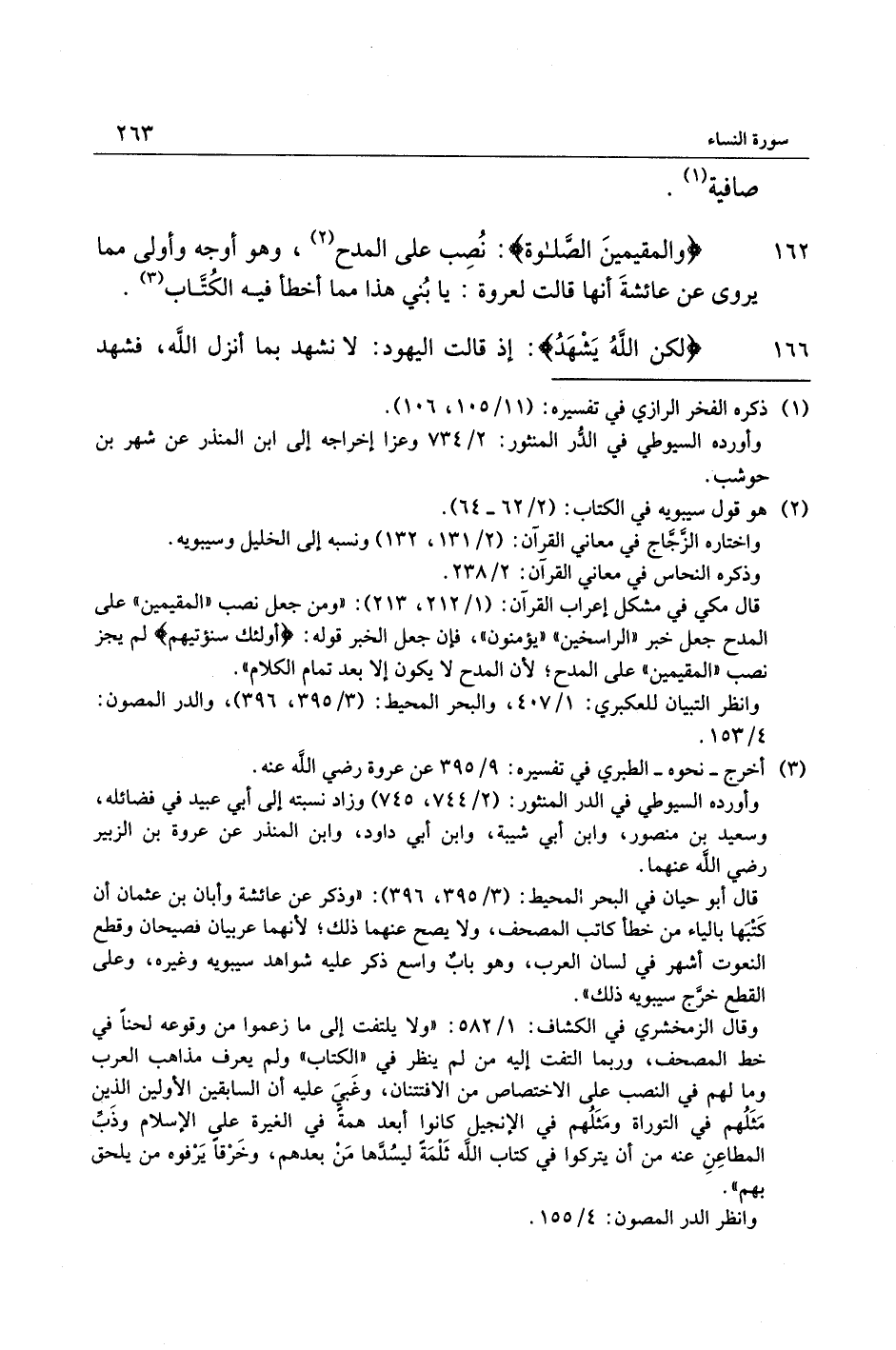 وقال الزمخشري في الكشاف: 1/ 582: «ولا يلتفت إلى ما زعموا من وقوعه لحنا في خط المصحف، وربما التفت إليه من لم ينظر في «الكتاب» ولم يعرف مذاهب العرب وما لهم في النصب على الاختصاص من الافتتان، وغبي عليه أن السابقين الأولين الذين مثلهم في التوراة ومثلهم في الإنجيل كانوا أبعد همة في الغيرة على الإسلام وذبّ المطاعن عنه من أن يتركوا في كتاب الله ثلمة ليسدّها من بعدهم، وخرقا يرفوه من يلحق بهم» .
