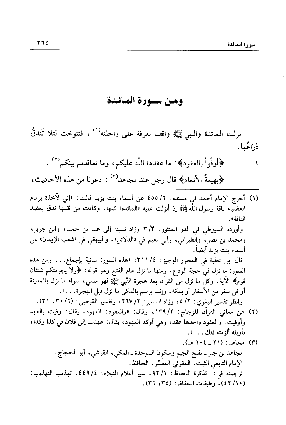 (1) أخرج الإمام أحمد في مسنده: 6/ 455 عن أسماء بنت يزيد قالت: «إني لآخذة بزمام العضباء ناقة رسول الله صلّى الله عليه وسلّم إذ أنزلت عليه «المائدة» كلها، وكادت من ثقلها تدق بعضد الناقة» .