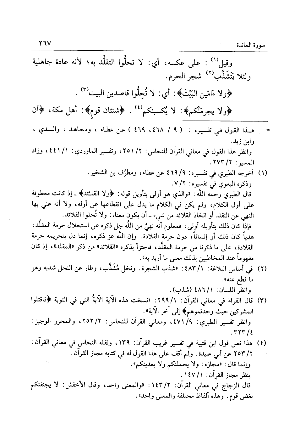 فإذا كان ذلك بتأويله أولى، فمعلوم أنه نهي من الله جل ذكره عن استحلال حرمة المقلّد، هديا كان ذلك أو إنسانا، دون حرمة القلادة. وإن الله عز ذكره، إنما دل بتحريمه حرمة القلادة، على ما ذكرنا من حرمة المقلّد، فاجتزأ بذكره «القلائد» من ذكر «المقلد» ، إذ كان مفهوما عند المخاطبين بذلك معنى ما أريد به» .