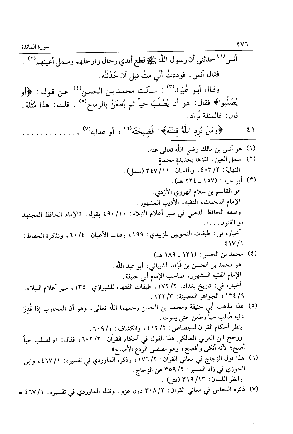 وقال أبو عبيد «3» : سألت محمد بن الحسن «4» عن قوله: أَوْ يُصَلَّبُوا فقال: هو أن يصلب حيا ثم يطعن بالرماح «5» . قلت: هذا مثلة.