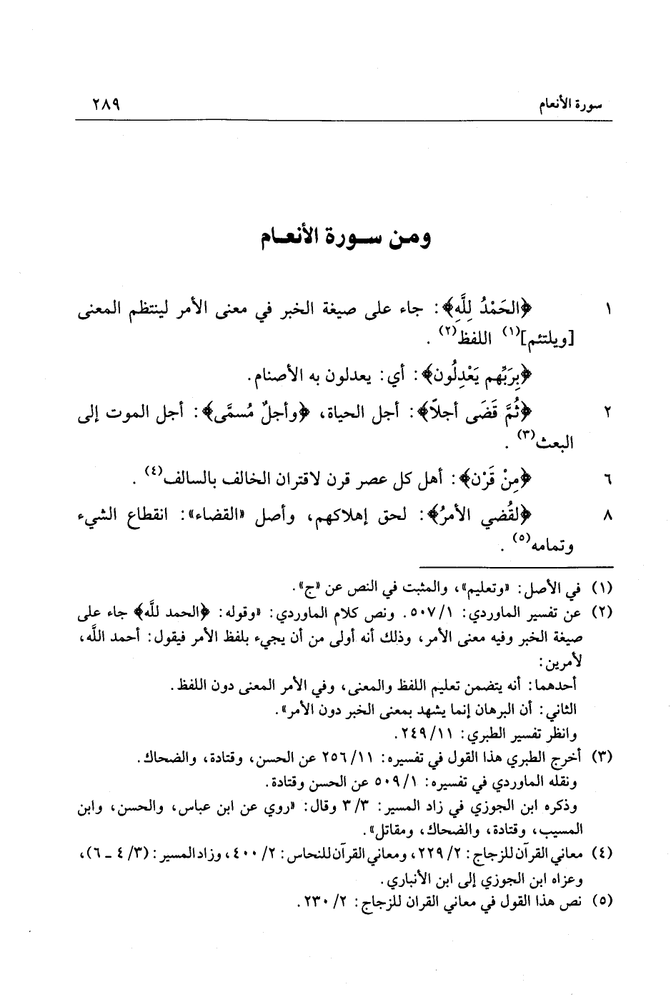 (2) عن تفسير الماوردي: 1/ 507. ونص كلام الماوردي: «وقوله: الْحَمْدُ لِلَّهِ جاء على صيغة الخبر وفيه معنى الأمر، وذلك أنه أولى من أن يجيء بلفظ الأمر فيقول: أحمد الله، لأمرين: