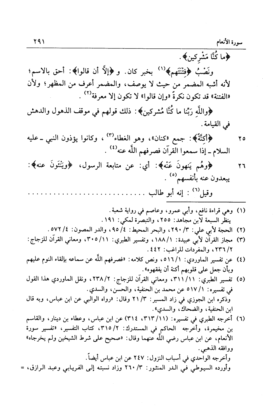 (6) أخرجه الطبري في تفسيره: (11/ 313، 314) عن ابن عباس، وعطاء بن دينار، والقاسم بن مخيمرة، وأخرجه الحاكم في المستدرك: 2/ 315، كتاب التفسير، «تفسير سورة الأنعام، عن ابن عباس رضي الله عنهما وقال: «صحيح على شرط الشيخين ولم يخرجاه» ووافقه الذهبي.