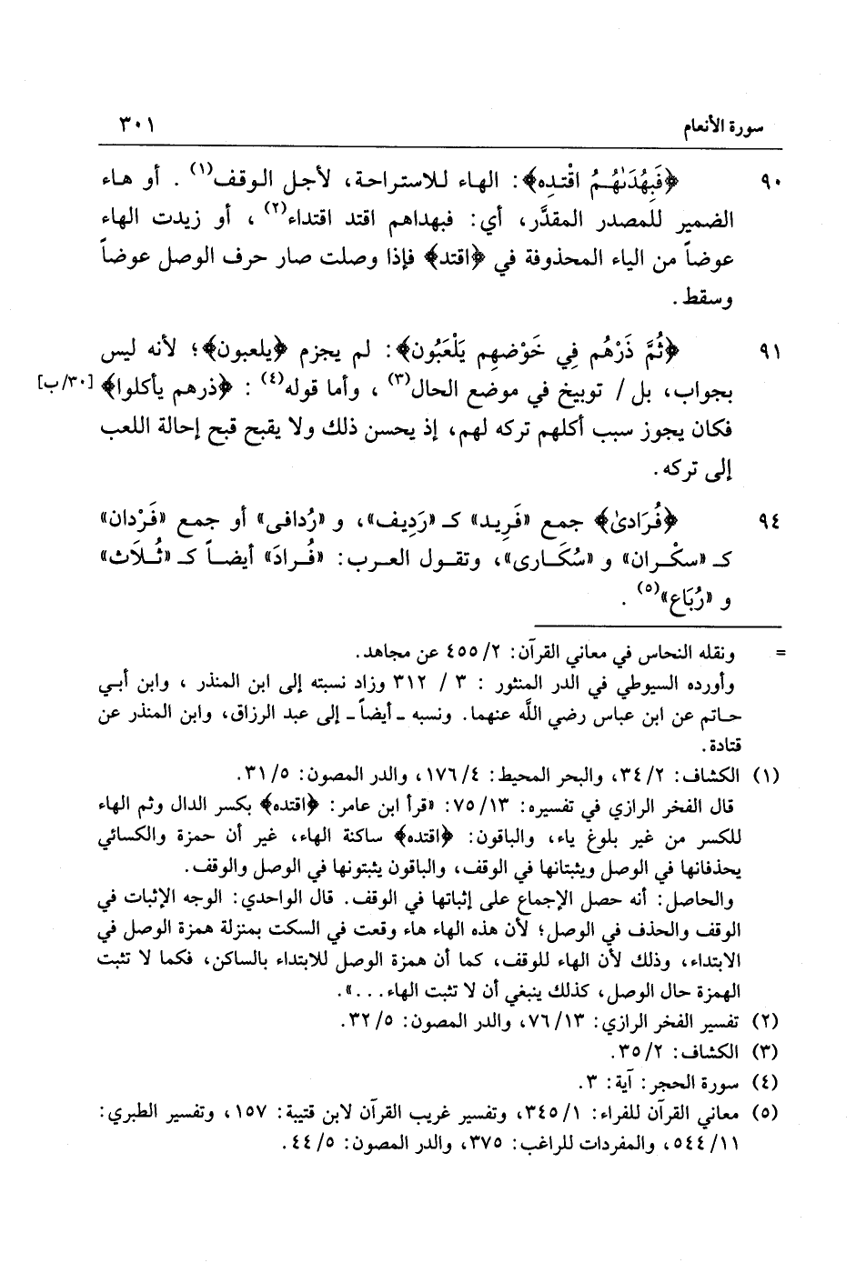 90 فَبِهُداهُمُ اقْتَدِهْ: الهاء للاستراحة، لأجل الوقف «1» . أو هاء الضمير للمصدر المقدّر، أي: فبهداهم اقتد اقتداء «2» ، أو زيدت الهاء عوضا من الياء المحذوفة في «اقتد» فإذا وصلت صار حرف الوصل عوضا وسقط.