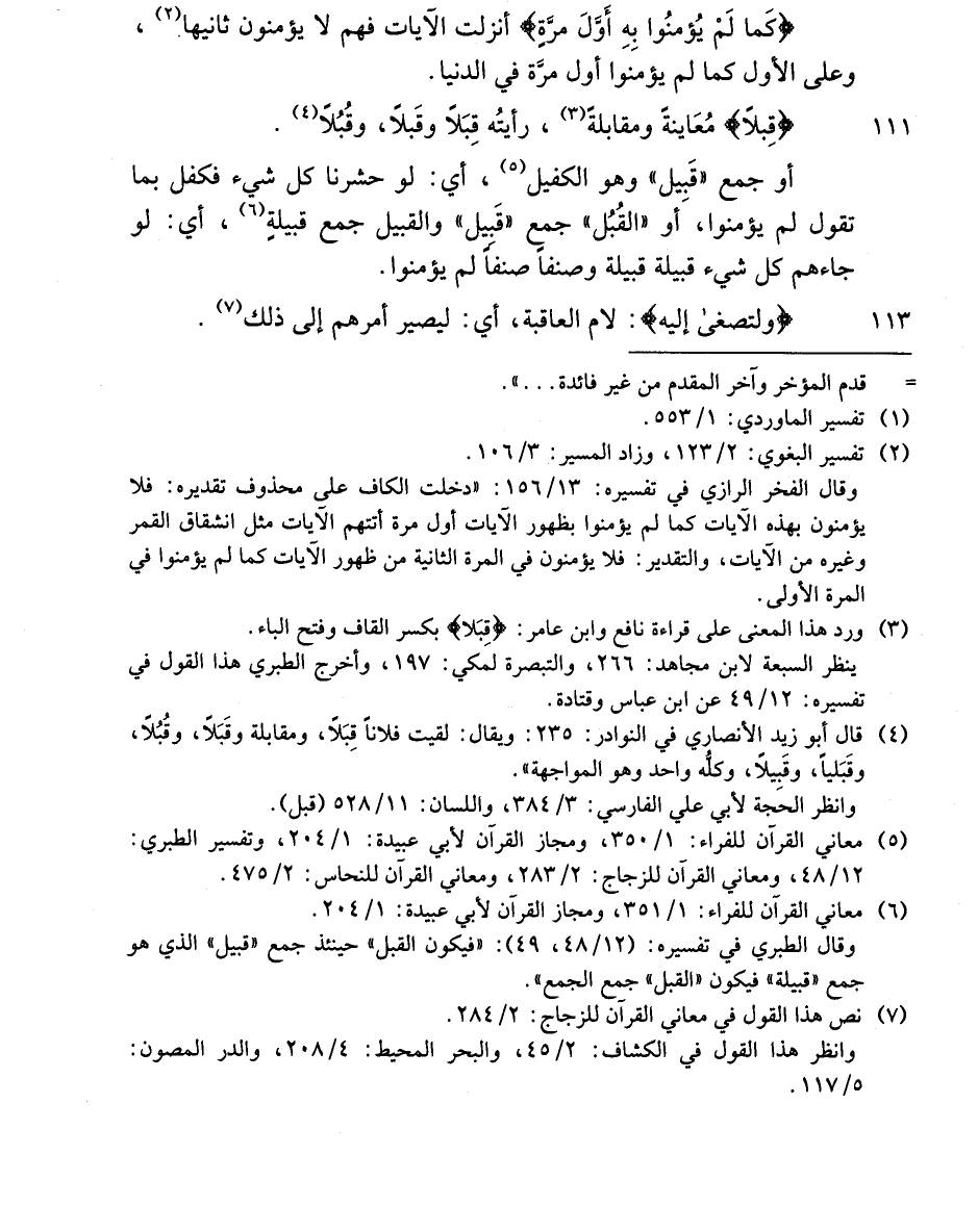 أو جمع «قبيل» وهو الكفيل «5» ، أي: لو حشرنا كل شيء فكفل بما تقول لم يؤمنوا، أو «القبل» جمع «قبيل» والقبيل جمع قبيلة «6» ، أي: لو جاءهم كل شيء قبيلة قبيلة وصنفا صنفا لم يؤمنوا.