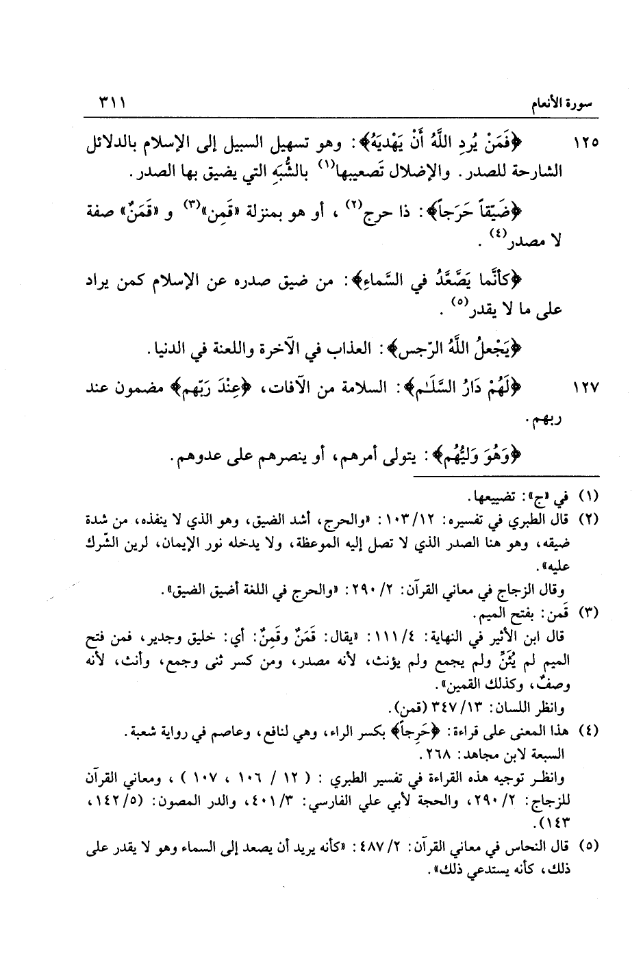 (2) قال الطبري في تفسيره: 12/ 103: «والحرج، أشد الضيق، وهو الذي لا ينفذه، من شدة ضيقه، وهو هنا الصدر الذي لا تصل إليه الموعظة، ولا يدخله نور الإيمان، لرين الشّرك عليه» .