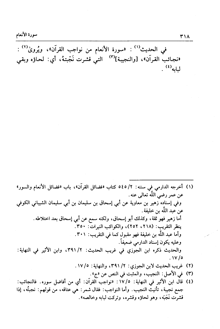 (1) أخرجه الدارمي في سننه: 2/ 545 كتاب «فضائل القرآن» ، باب «فضائل الأنعام والسور» عن عمر رضي الله تعالى عنه.