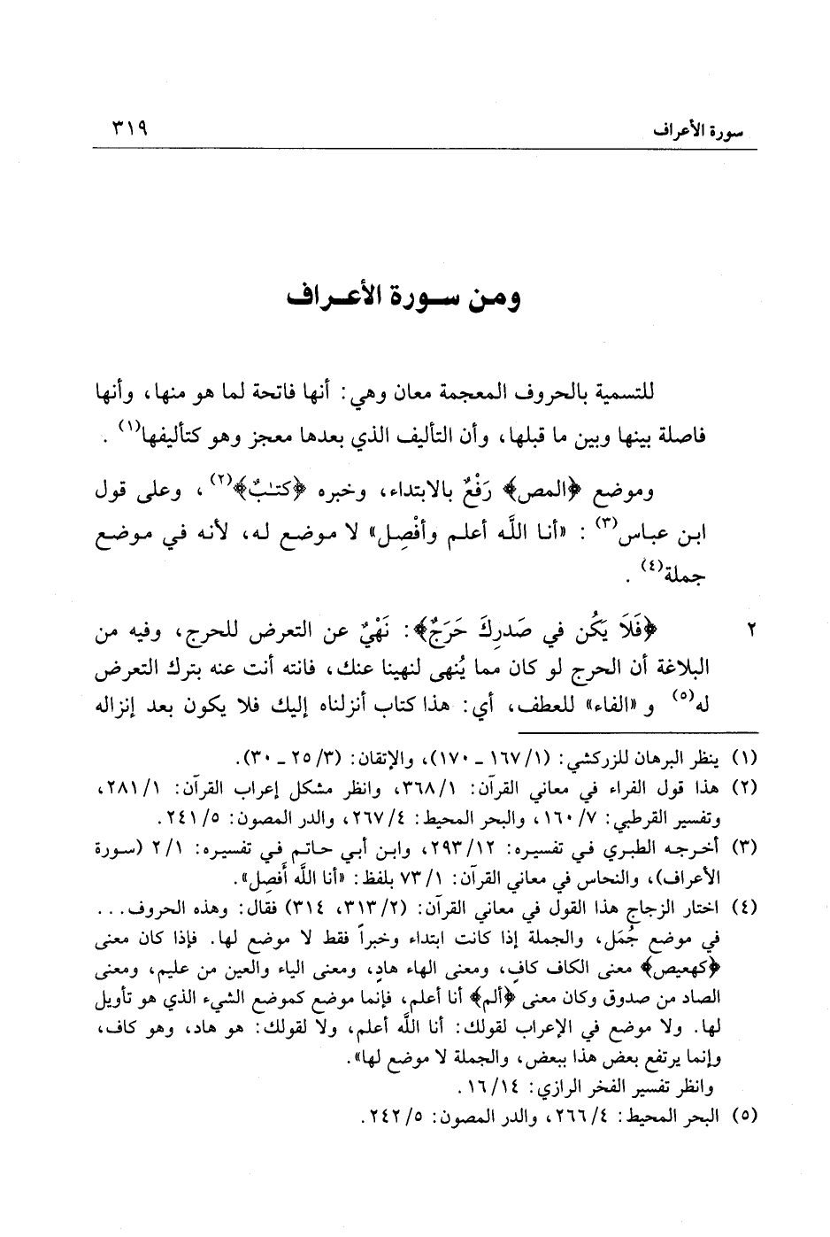 (3) أخرجه الطبري في تفسيره: 12/ 293، وابن أبي حاتم في تفسيره: 1/ 2 (سورة الأعراف) ، والنحاس في معاني القرآن: 1/ 73 بلفظ: «أنا الله أفصل» .