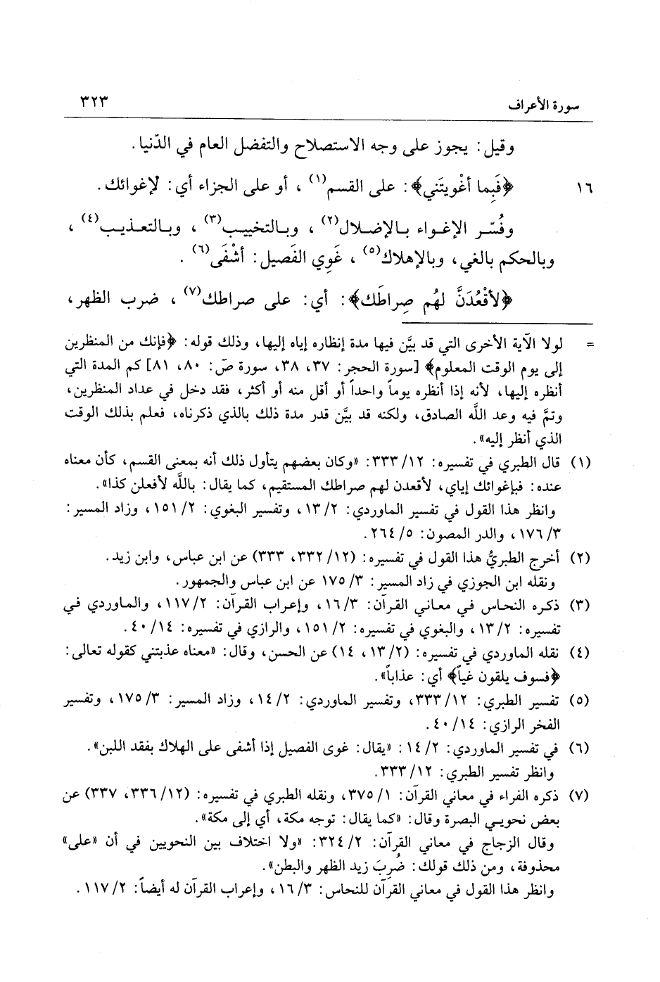 (1) قال الطبري في تفسيره: 12/ 333: «وكان بعضهم يتأول ذلك أنه بمعنى القسم، كأن معناه عنده: فبإغوائك إياي، لأقعدن لهم صراطك المستقيم، كما يقال: بالله لأفعلن كذا» .