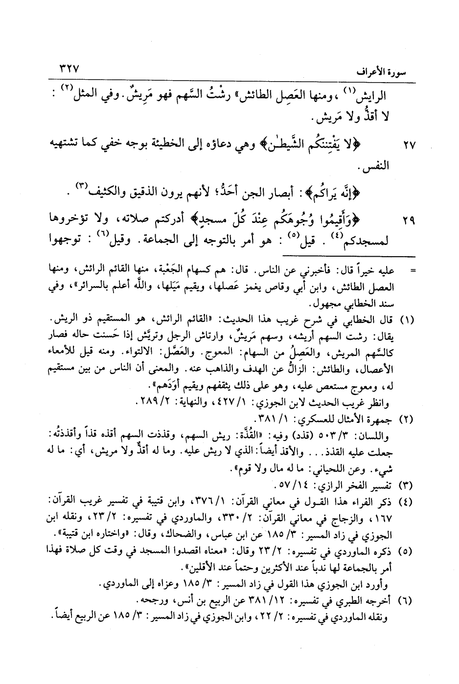 (5) ذكره الماوردي في تفسيره: 2/ 23 وقال: «معناه اقصدوا المسجد في وقت كل صلاة فهذا أمر بالجماعة لها ندبا عند الأكثرين وحتما عند الأقلين» .