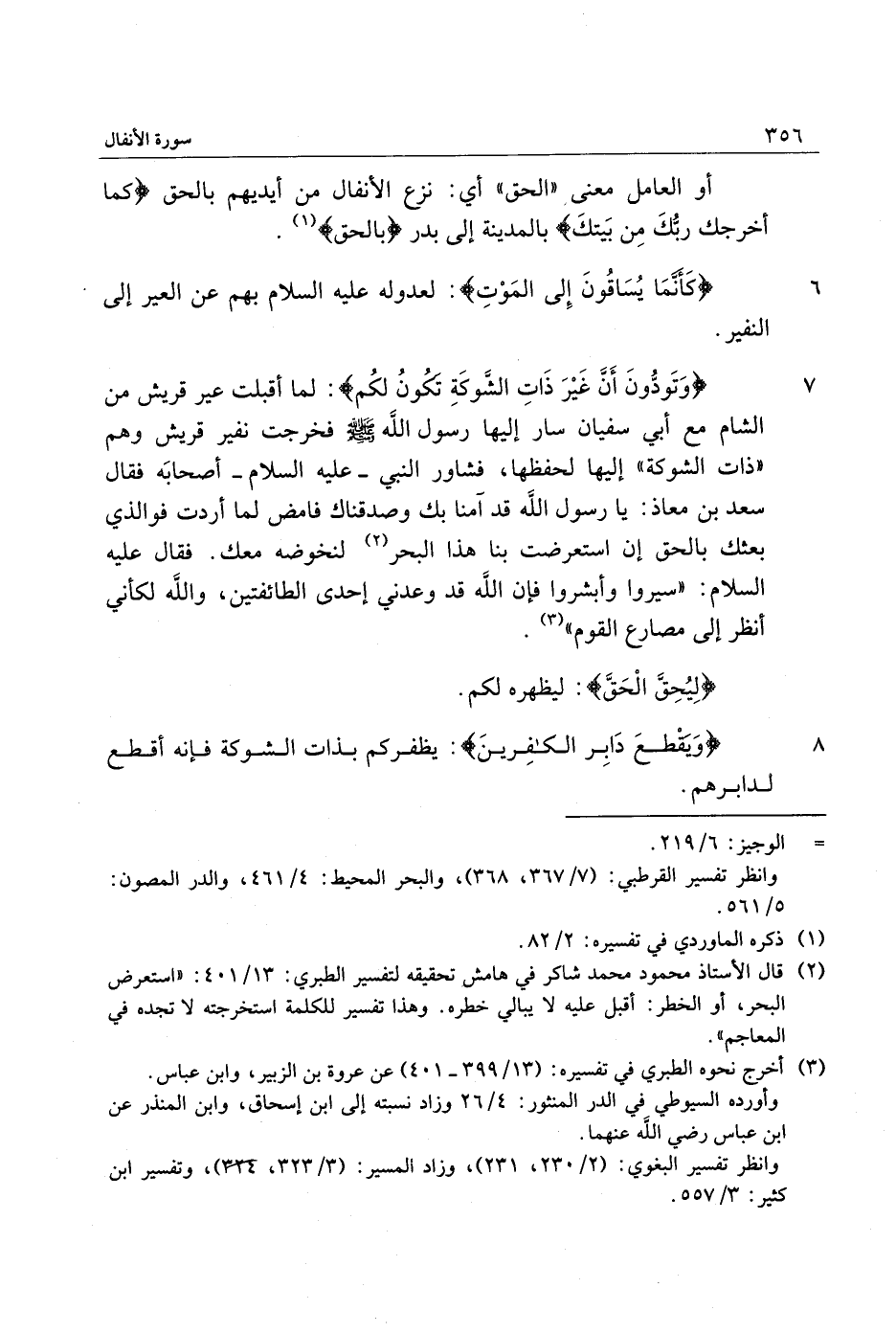 7 وَتَوَدُّونَ أَنَّ غَيْرَ ذاتِ الشَّوْكَةِ تَكُونُ لَكُمْ: لما أقبلت عير قريش من الشام مع أبي سفيان سار إليها رسول الله صلّى الله عليه وسلّم فخرجت نفير قريش وهم «ذات الشوكة» إليها لحفظها، فشاور النبي- عليه السلام- أصحابه فقال سعد بن معاذ: يا رسول الله قد آمنا بك وصدقناك فامض لما أردت فو الذي بعثك بالحق إن استعرضت بنا هذا البحر «2» لنخوضه معك. فقال عليه السلام: «سيروا وأبشروا فإن الله قد وعدني إحدى الطائفتين، والله لكأني أنظر إلى مصارع القوم» «3» .
