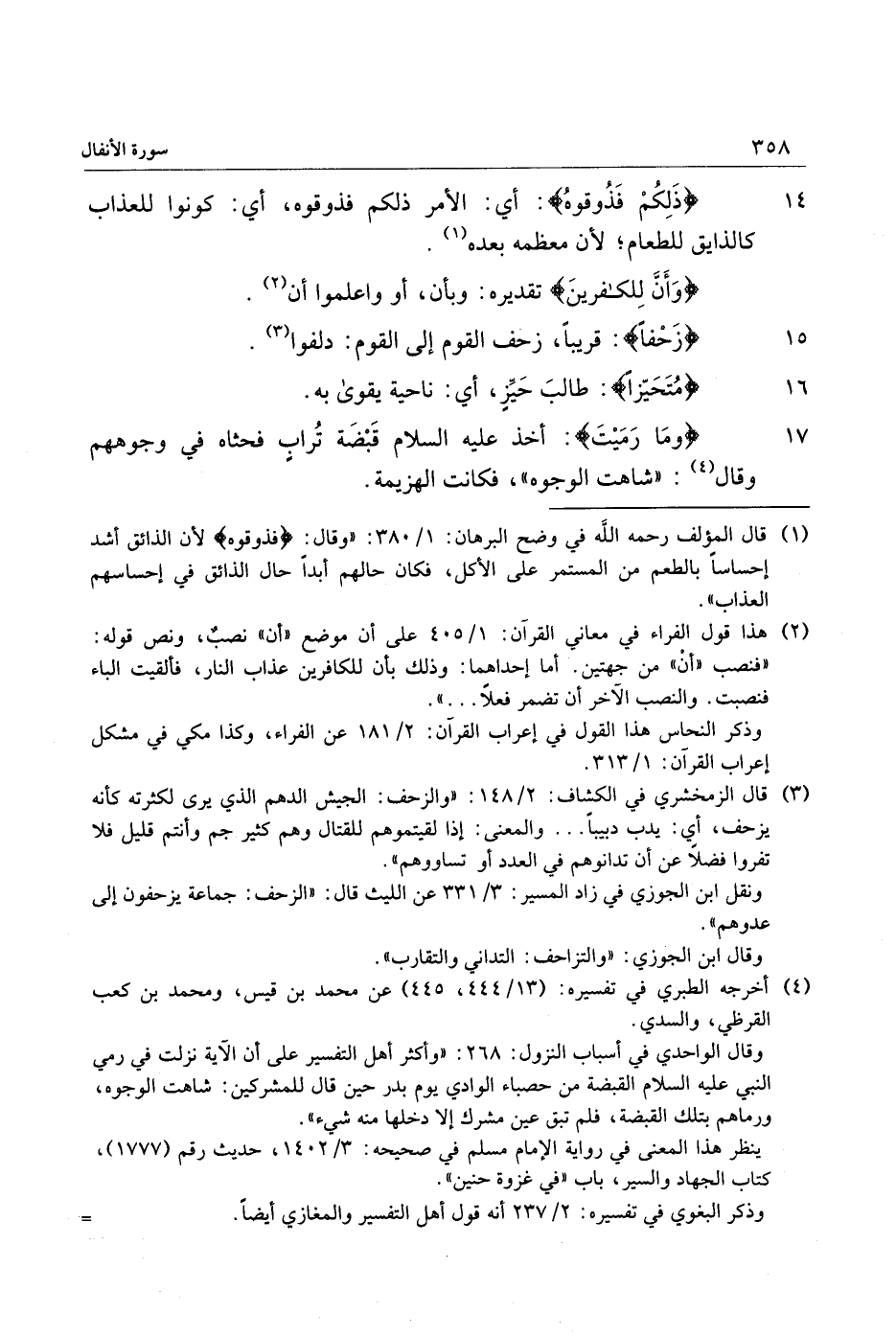 (3) قال الزمخشري في الكشاف: 2/ 148: «والزحف: الجيش الدهم الذي يرى لكثرته كأنه يزحف، أي: يدب دبيبا ... والمعنى: إذا لقيتموهم للقتال وهم كثير جم وأنتم قليل فلا تفروا فضلا عن أن تدانوهم في العدد أو تساووهم» .