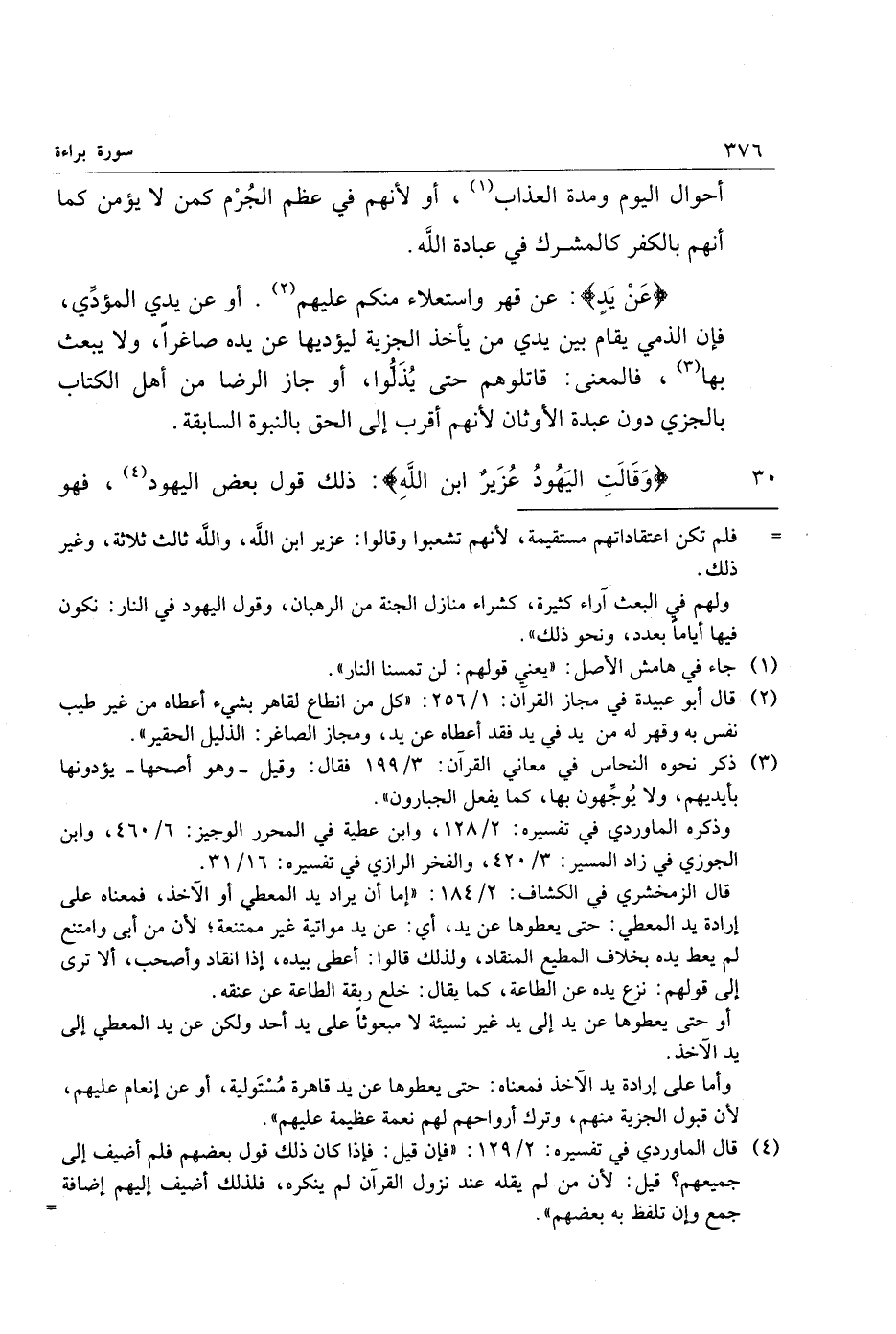 قال الزمخشري في الكشاف: 2/ 184: «إما أن يراد يد المعطي أو الآخذ، فمعناه على إرادة يد المعطي: حتى يعطوها عن يد، أي: عن يد مواتية غير ممتنعة لأن من أبى وامتنع لم يعط يده بخلاف المطيع المنقاد، ولذلك قالوا: أعطى بيده، إذا انقاد وأصحب، ألا ترى إلى قولهم: نزع يده عن الطاعة، كما يقال: خلع ربقة الطاعة عن عنقه.