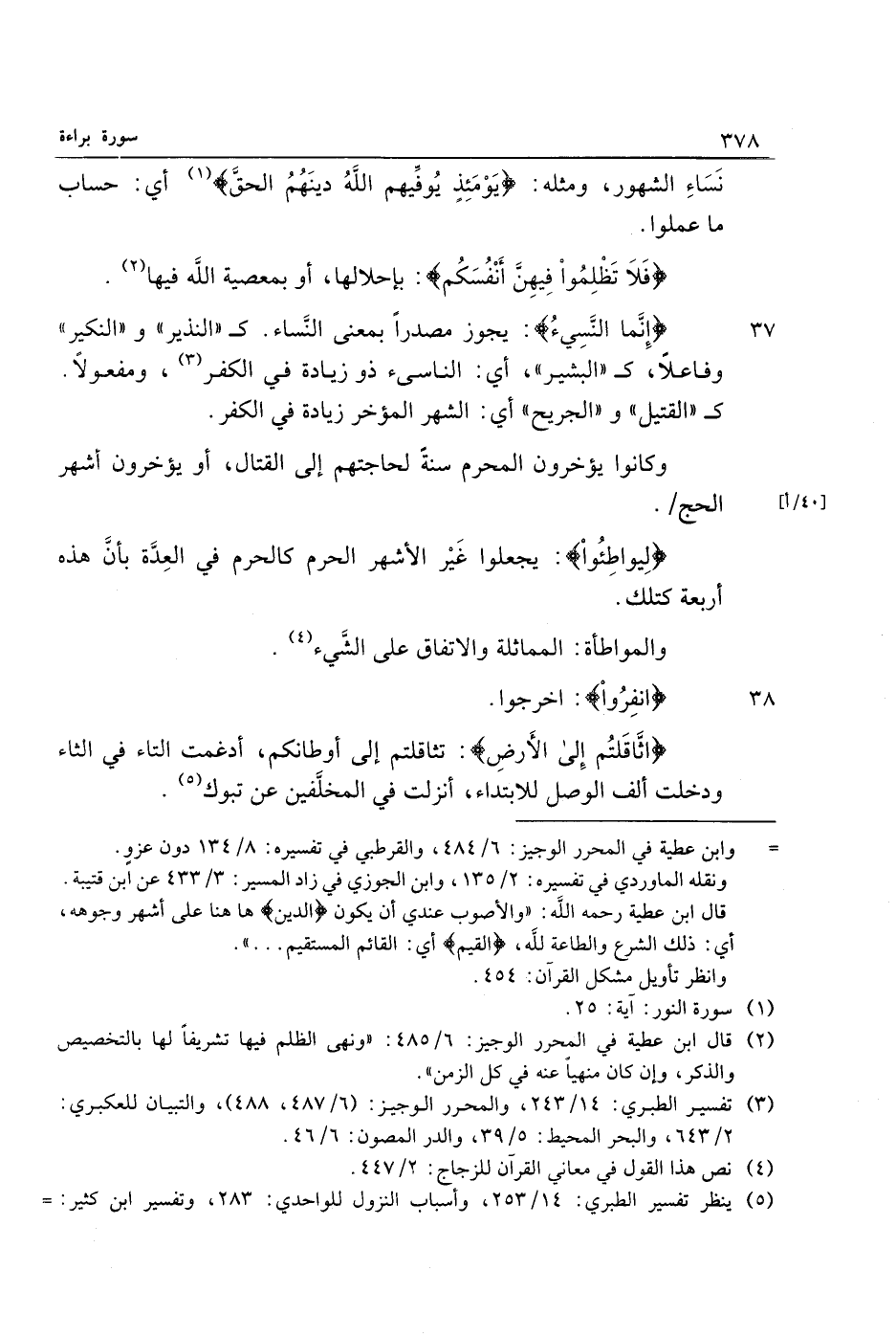37 إِنَّمَا النَّسِيءُ: يجوز مصدرا بمعنى النّساء. ك «النذير» و «النكير» وفاعلا، ك «البشير» ، أي: الناسئ ذو زيادة في الكفر «3» ، ومفعولا.