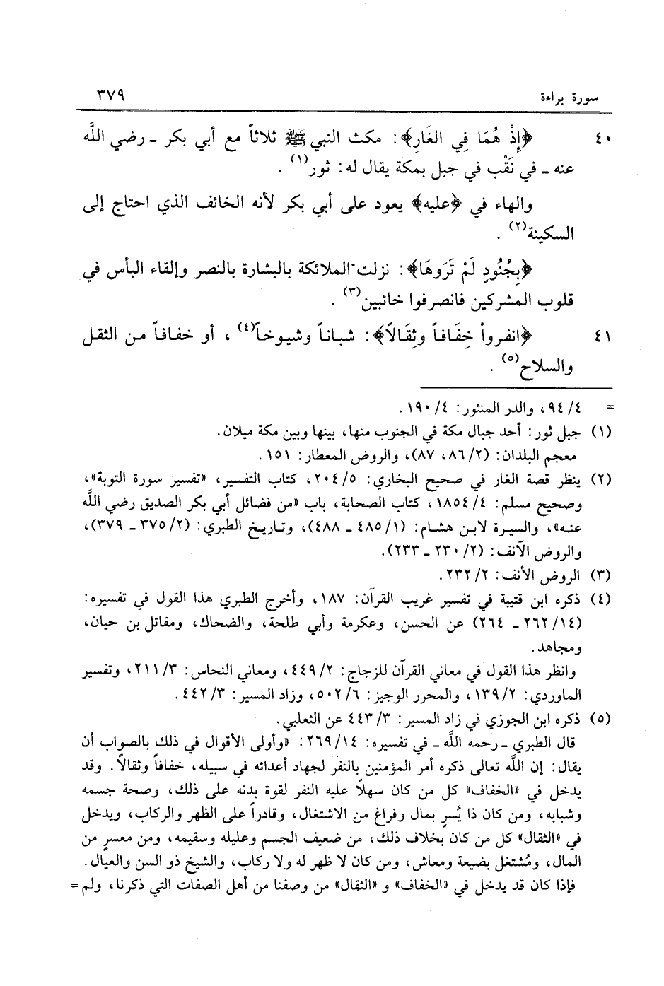 41 انْفِرُوا خِفافاً وَثِقالًا: شبانا وشيوخا «4» ، أو خفافا من الثقل والسلاح «5» .