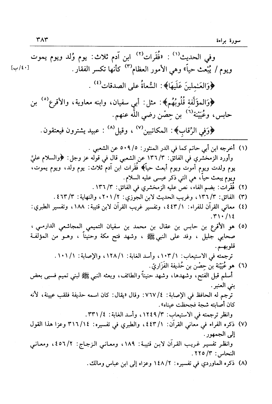 وفي الحديث «1» : «فقرات «2» ابن آدم ثلاث: يوم ولد ويوم يموت ويوم/ يبعث حيا» وهي الأمور العظام «3» كأنها تكسر الفقار. [40/ ب] وَالْعامِلِينَ عَلَيْها: السّعاة على الصدقات «4» .