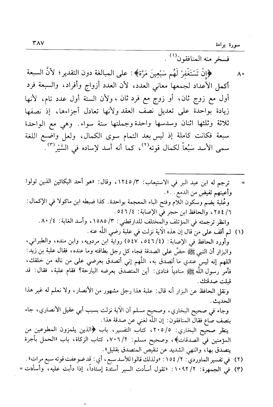 80 إِنْ تَسْتَغْفِرْ لَهُمْ سَبْعِينَ مَرَّةً: على المبالغة دون التقدير لأنّ السبعة أكمل الأعداد لجمعها معاني العدد، لأن العدد أزواج وأفراد، والسبعة فرد أول مع زوج ثان، أو زوج مع فرد ثان، ولأن السنة أول عدد تام، لأنها زيادة بواحدة على تعديل نصف العقد ولأنها تعادل أجزاءها، إذ نصفها ثلاثة وثلثها اثنان وسدسها واحدة وجملتها ستة سواء. وهي مع الواحدة سبعة فكانت كاملة إذ ليس بعد التمام سوى الكمال، ولعل واضع اللغة سمى الأسد سبعا لكمال قوته «2» ، كما أنه أسد لإساده في السّير «3» .