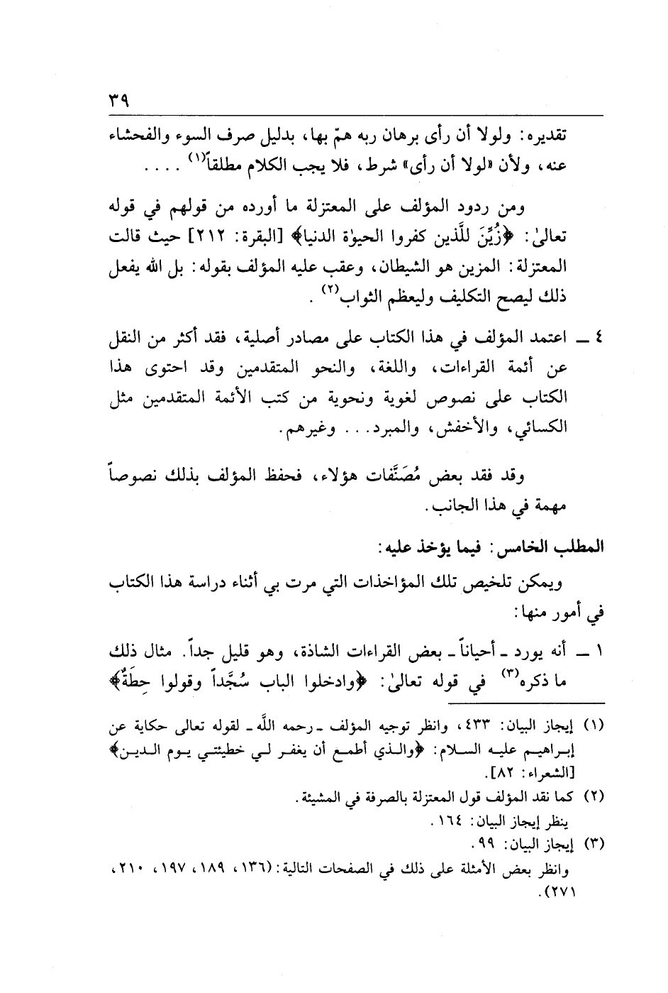 ومن ردود المؤلف على المعتزلة ما أورده من قولهم في قوله تعالى: زُيِّنَ لِلَّذِينَ كَفَرُوا الْحَياةُ الدُّنْيا [البقرة: 212] حيث قالت المعتزلة: المزين هو الشيطان، وعقب عليه المؤلف بقوله: بل الله يفعل ذلك ليصح التكليف وليعظم الثواب «2» .