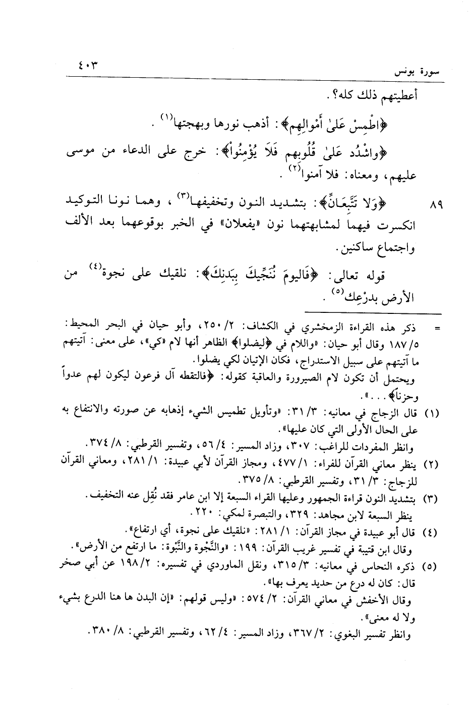 89 وَلا تَتَّبِعانِّ: بتشديد النون وتخفيفها «3» ، وهما نونا التوكيد انكسرت فيهما لمشابهتهما نون «يفعلان» في الخبر بوقوعهما بعد الألف واجتماع ساكنين.