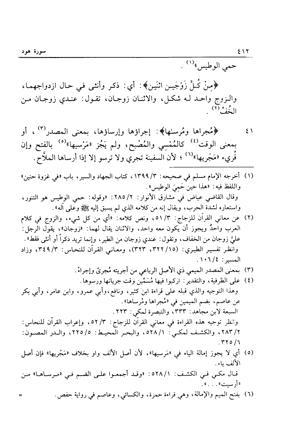 41 مَجْراها وَمُرْساها: إجراؤها وإرساؤها، بمعنى المصدر «3» ، أو بمعنى الوقت «4» كالممسي والمصبح، ولم يجز «مرسيها» «5» بالفتح وإن قريء «مجريها» «6» لأن السفينة تجري ولا ترسو إلا إذا أرساها الملّاح.