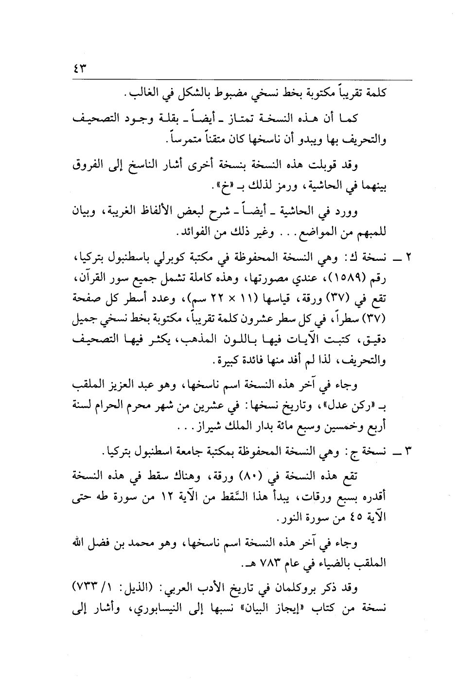 2- نسخة ك: وهي النسخة المحفوظة في مكتبة كوبرلي باسطنبول بتركيا، رقم (1589) ، عندي مصورتها، وهذه كاملة تشمل جميع سور القرآن، تقع في (37) ورقة، قياسها (11 22 سم) ، وعدد أسطر كل صفحة (37) سطرا، في كل سطر عشرون كلمة تقريبا، مكتوبة بخط نسخي جميل دقيق، كتبت الآيات فيها باللون المذهب، يكثر فيها التصحيف والتحريف، لذا لم أفد منها فائدة كبيرة.