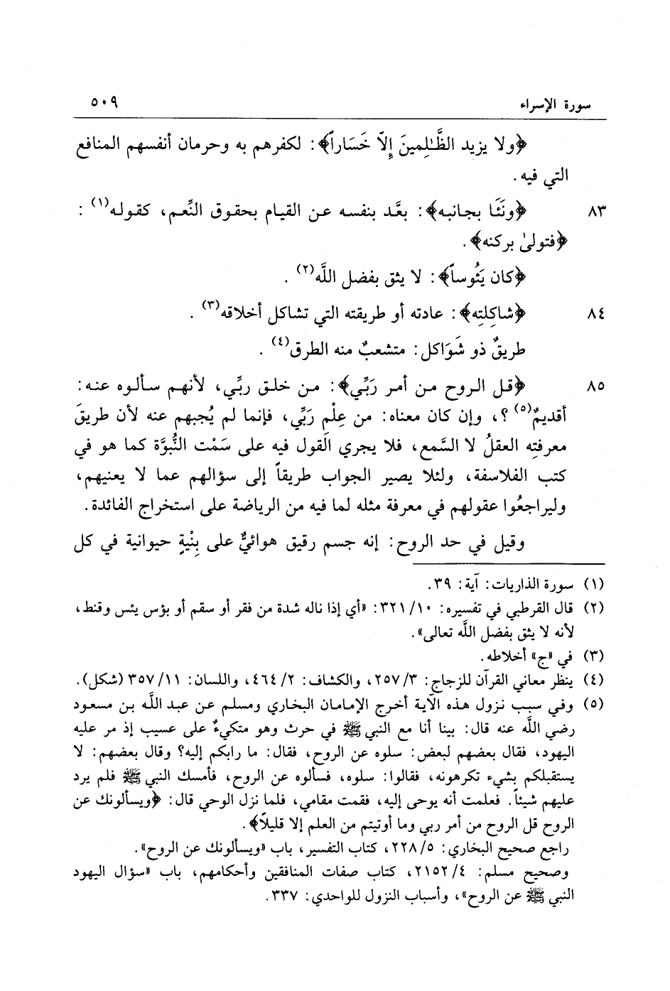 (5) وفي سبب نزول هذه الآية أخرج الإمامان البخاري ومسلم عن عبد الله بن مسعود رضي الله عنه قال: بينا أنا مع النبي صلى الله عليه وسلم في حرث وهو متكئ على عسيب إذ مر عليه اليهود، فقال بعضهم لبعض: سلوه عن الروح، فقال: ما رابكم إليه؟ وقال بعضهم: لا يستقبلكم بشيء تكرهونه، فقالوا: سلوه، فسألوه عن الروح، فأمسك النبي صلى الله عليه وسلم فلم يرد عليهم شيئا. فعلمت أنه يوحى إليه، فقمت مقامي، فلما نزل الوحي قال: وَيَسْئَلُونَكَ عَنِ الرُّوحِ قُلِ الرُّوحُ مِنْ أَمْرِ رَبِّي وَما أُوتِيتُمْ مِنَ الْعِلْمِ إِلَّا قَلِيلًا.