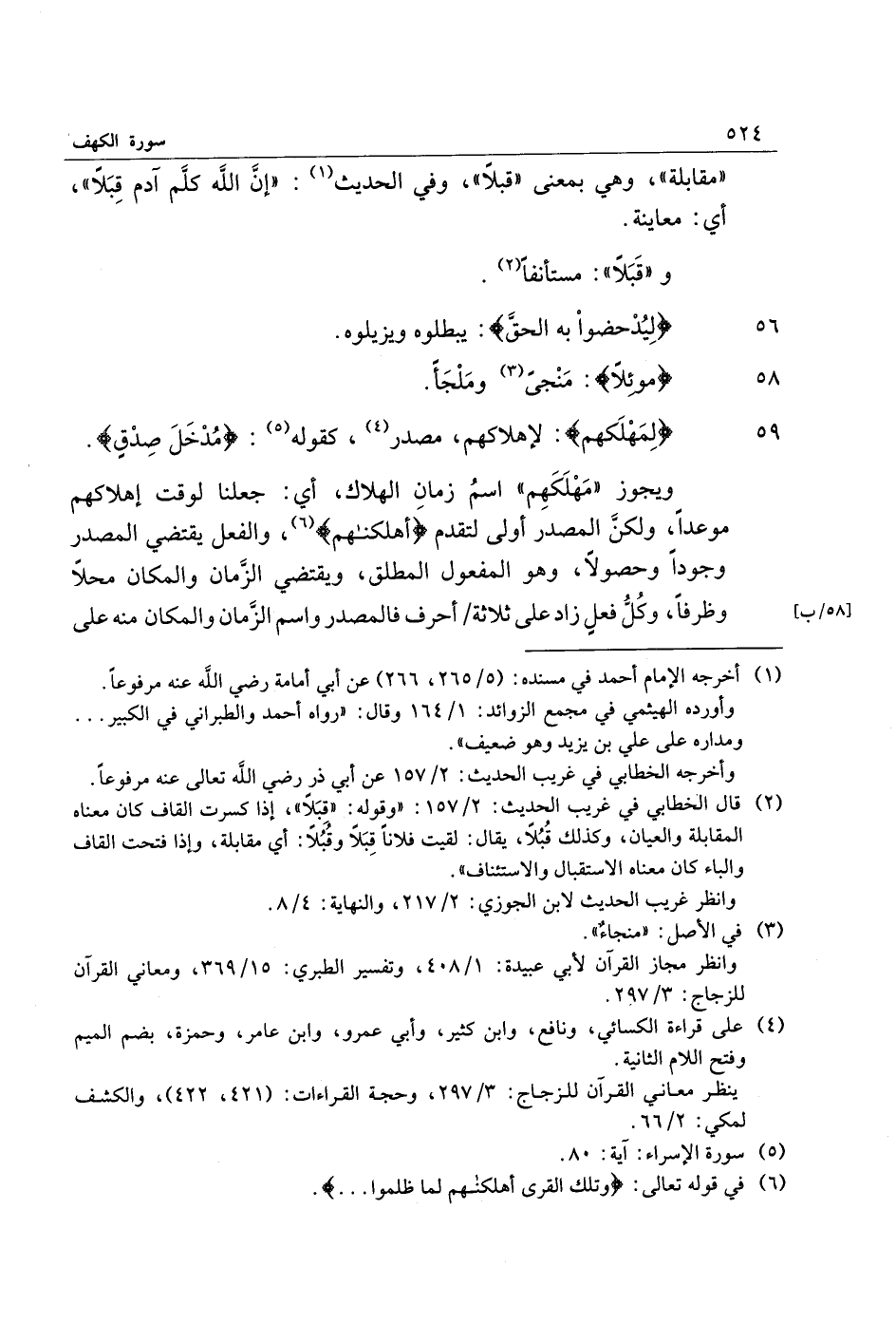 ويجوز «مهلكهم» اسم زمان الهلاك، أي: جعلنا لوقت إهلاكهم موعدا، ولكنّ المصدر أولى لتقدم أَهْلَكْناهُمْ «6» ، والفعل يقتضي المصدر وجودا وحصولا، وهو المفعول المطلق، ويقتضي الزّمان والمكان محلا وظرفا، وكلّ فعل زاد على ثلاثة/ أحرف فالمصدر واسم الزّمان والمكان منه على