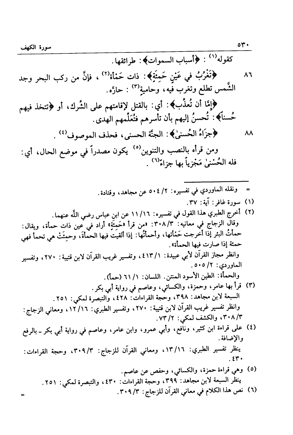 86 تَغْرُبُ فِي عَيْنٍ حَمِئَةٍ: ذات حمأة «2» ، فإنّ من ركب البحر وجد الشّمس تطلع وتغرب فيه، وحامية «3» : حارّه.