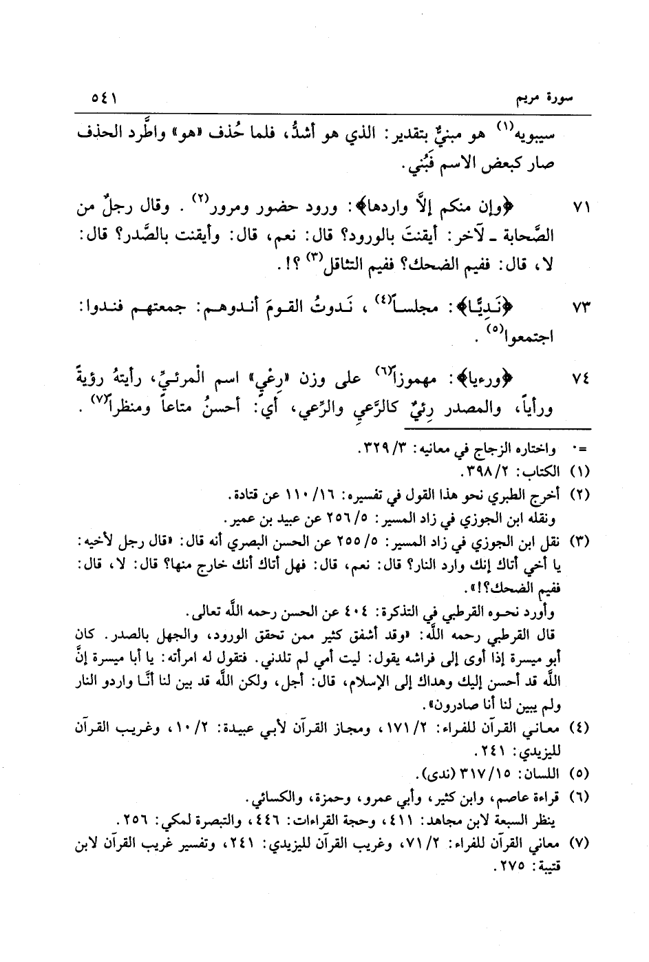 71 وَإِنْ مِنْكُمْ إِلَّا وارِدُها: ورود حضور ومرور «2» . وقال رجل من الصّحابة- لآخر: أيقنت بالورود؟ قال: نعم، قال: وأيقنت بالصّدر؟ قال: