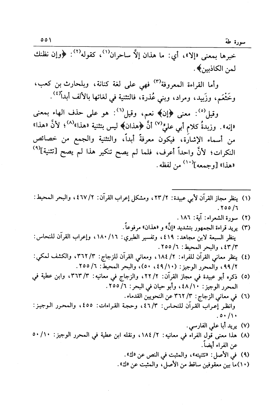 وقيل «5» : معنى إِنْ نعم، وقيل «6» : هو على حذف الهاء بمعنى «إنه» . وزبدة كلام أبي عليّ «7» أنّ هذانِ ليس بتثنية «هذا» «8» لأنّ «هذا» من أسماء الإشارة، فيكون معرفة أبدا، والتثنية والجمع من خصائص النكرات لأنّ واحدا أعرف، فلما لم يصح تنكير هذا لم يصح [تثنية] «9» «هذا» [وجمعه] «10» من لفظه.
