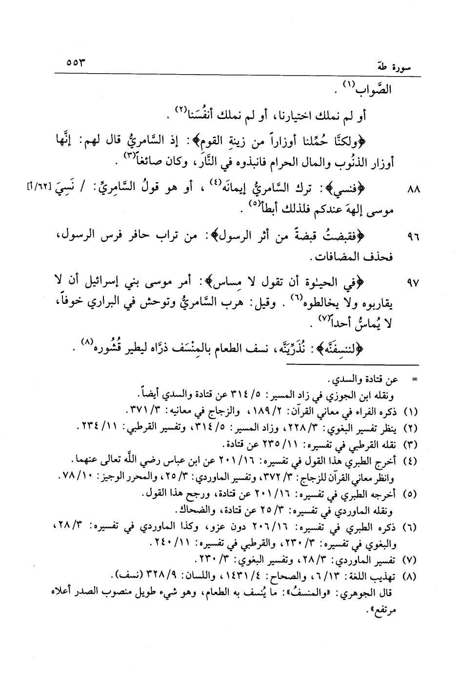 96 فَقَبَضْتُ قَبْضَةً مِنْ أَثَرِ الرَّسُولِ: من تراب حافر فرس الرسول، فحذف المضافات.