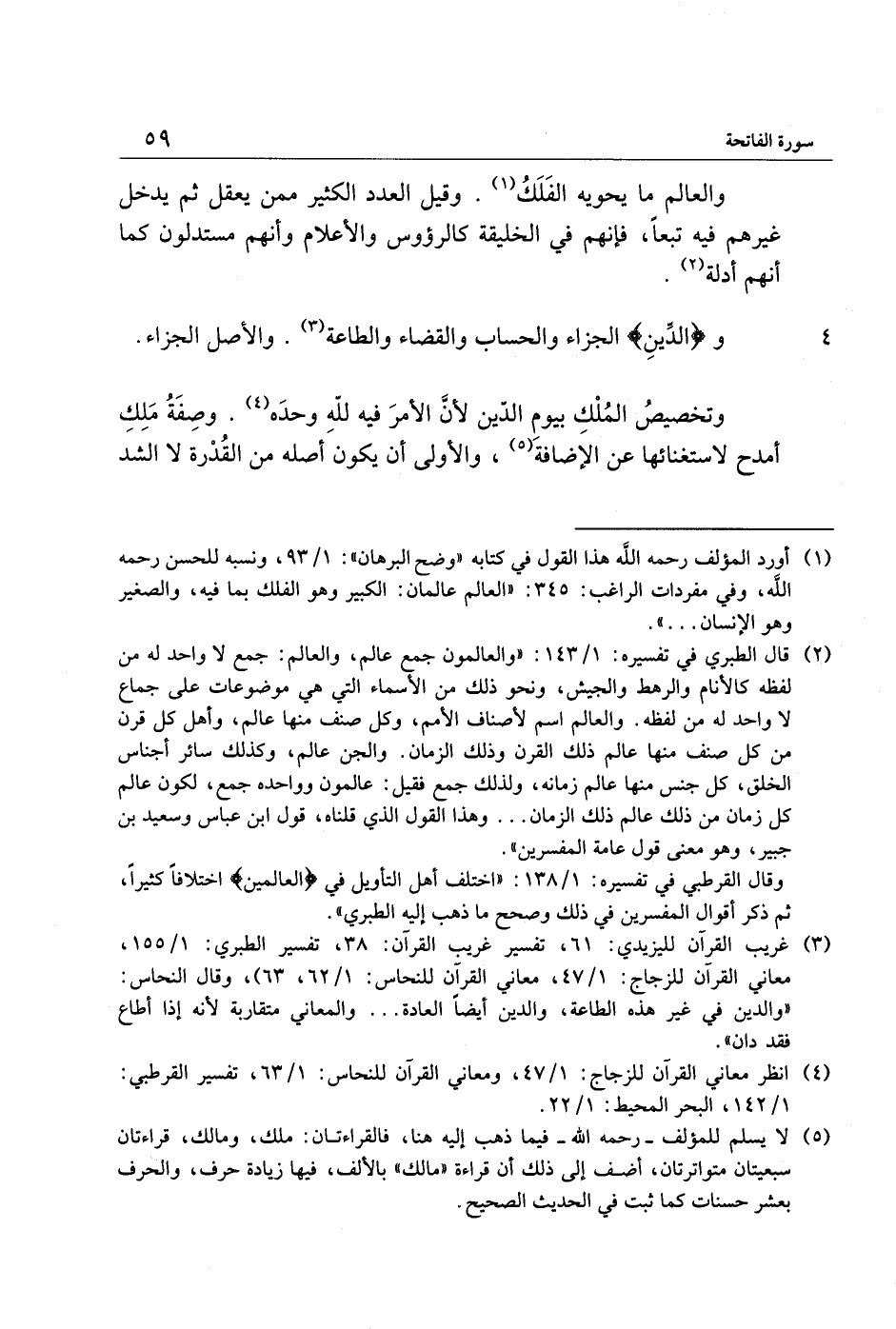 (2) قال الطبري في تفسيره: 1/ 143: «والعالمون جمع عالم، والعالم: جمع لا واحد له من لفظه كالأنام والرهط والجيش، ونحو ذلك من الأسماء التي هي موضوعات على جماع لا واحد له من لفظه. والعالم اسم لأصناف الأمم، وكل صنف منها عالم، وأهل كل قرن من كل صنف منها عالم ذلك القرن وذلك الزمان. والجن عالم، وكذلك سائر أجناس الخلق، كل جنس منها عالم زمانه، ولذلك جمع فقيل: عالمون وواحده جمع، لكون عالم كل زمان من ذلك عالم ذلك الزمان ... وهذا القول الذي قلناه، قول ابن عباس وسعيد بن جبير، وهو معنى قول عامة المفسرين» .