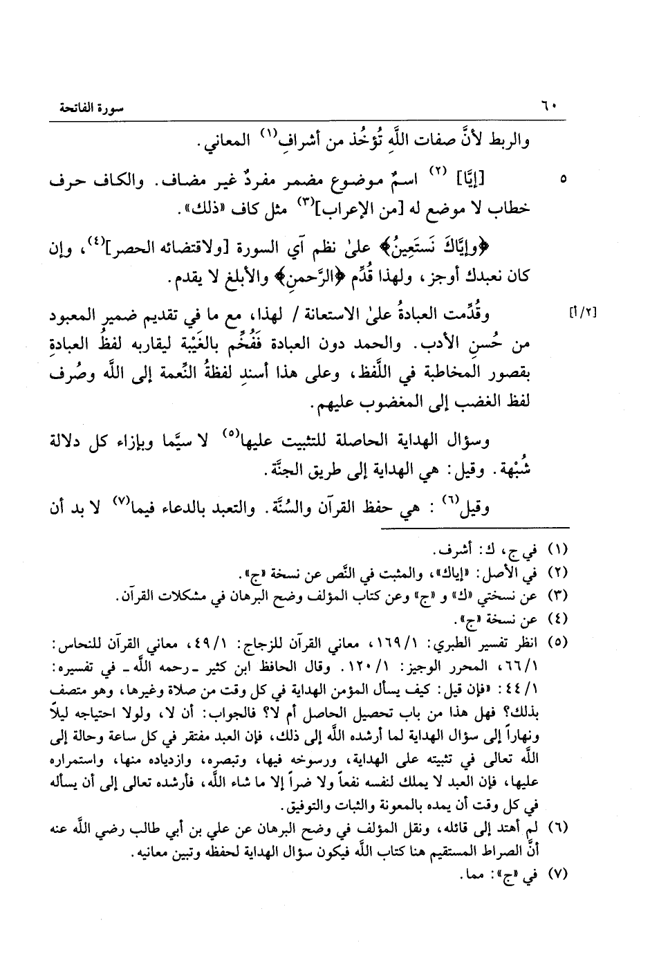 1/ 44: «فإن قيل: كيف يسأل المؤمن الهداية في كل وقت من صلاة وغيرها، وهو متصف بذلك؟ فهل هذا من باب تحصيل الحاصل أم لا؟ فالجواب: أن لا، ولولا احتياجه ليلا ونهارا إلى سؤال الهداية لما أرشده الله إلى ذلك، فإن العبد مفتقر في كل ساعة وحالة إلى الله تعالى في تثبيته على الهداية، ورسوخه فيها، وتبصره، وازدياده منها، واستمراره عليها، فإن العبد لا يملك لنفسه نفعا ولا ضرا إلا ما شاء الله، فأرشده تعالى إلى أن يسأله في كل وقت أن يمده بالمعونة والثبات والتوفيق.
