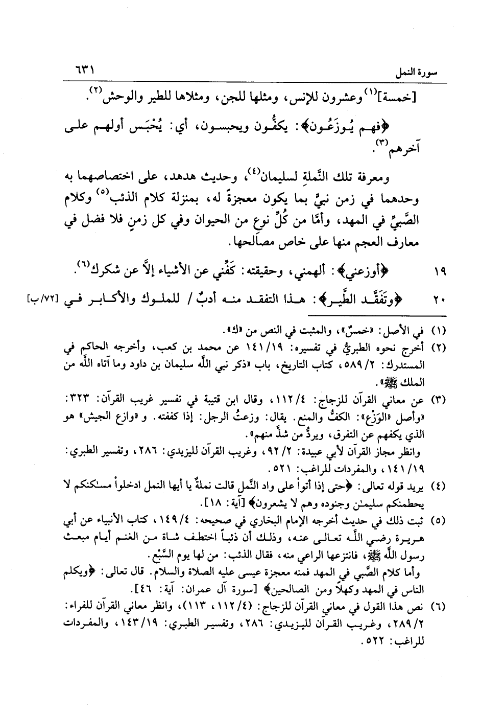 (4) يريد قوله تعالى: حَتَّى إِذا أَتَوْا عَلى وادِ النَّمْلِ قالَتْ نَمْلَةٌ يا أَيُّهَا النَّمْلُ ادْخُلُوا مَساكِنَكُمْ لا يَحْطِمَنَّكُمْ سُلَيْمانُ وَجُنُودُهُ وَهُمْ لا يَشْعُرُونَ [آية: 18] .