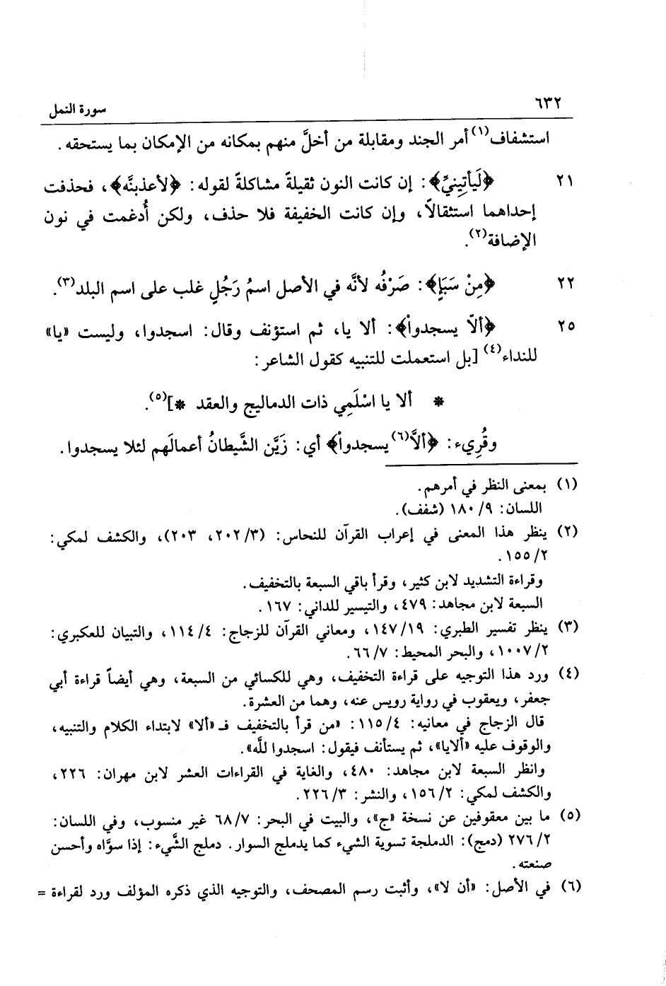 21 لَيَأْتِيَنِّي: إن كانت النون ثقيلة مشاكلة لقوله: لَأُعَذِّبَنَّهُ، فحذفت إحداهما استثقالا، وإن كانت الخفيفة فلا حذف، ولكن أدغمت في نون الإضافة «2» .