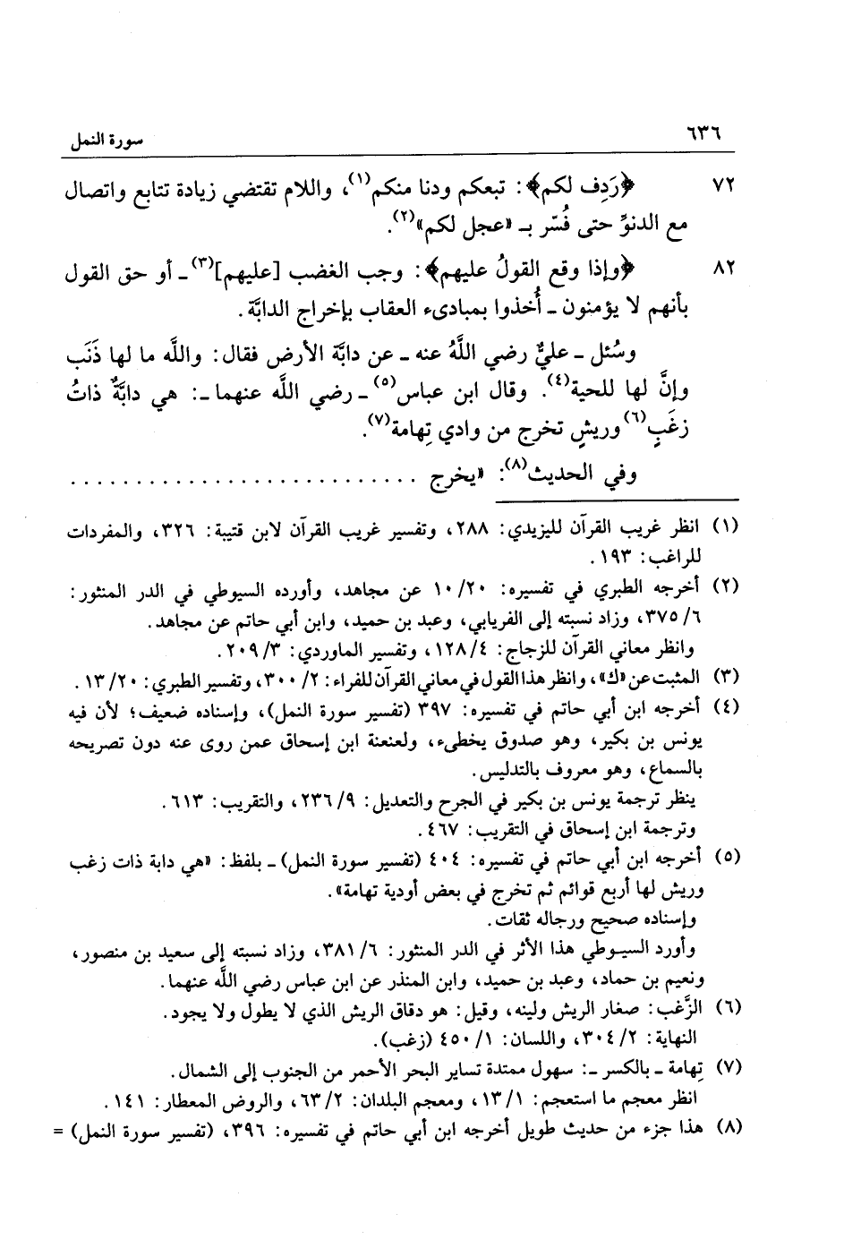 (5) أخرجه ابن أبي حاتم في تفسيره: 404 (تفسير سورة النمل) - بلفظ: «هي دابة ذات زغب وريش لها أربع قوائم ثم تخرج في بعض أودية تهامة» .