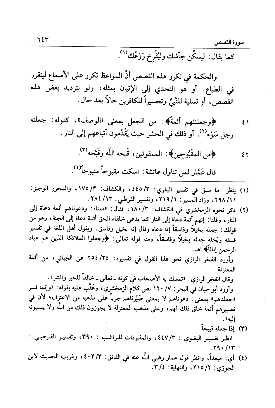 وأورد أبو حيان في البحر: 7/ 120 نص كلام الزمخشري، وعقّب عليه بقوله: «وإنما فسر «جعلناهم» بمعنى: دعوناهم لا بمعنى صيّرناهم جريا على مذهبه من الاعتزال لأن في تصييرهم أئمة خلق ذلك لهم، وعلى مذهب المعتزلة لا يجوزون ذلك من الله ولا ينسبونه إليه» .