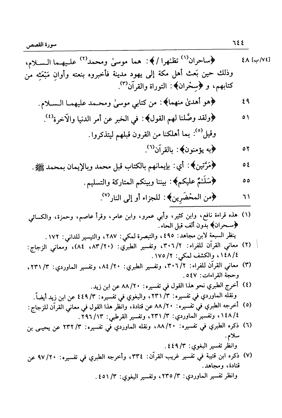 [74/ ب] ساحران «1» تظاهرا/: هما موسى ومحمد «2» عليهما السلام، وذلك حين بعث أهل مكة إلى يهود مدينة فأخبروه بنعته وأوان مبعثه من كتابهم، وسِحْرانِ: التوراة والقرآن «3» .
