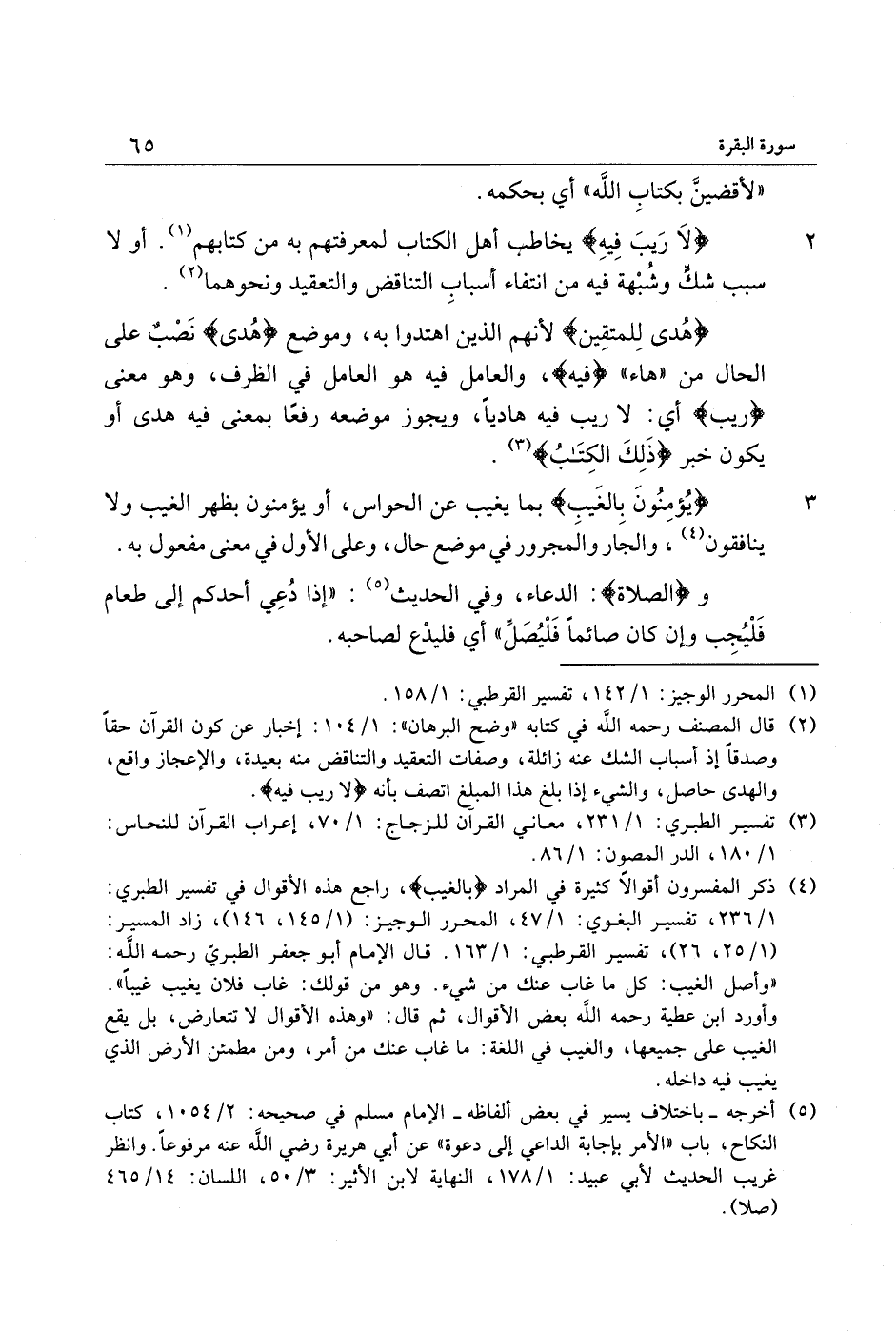 (2) قال المصنف رحمه الله في كتابه «وضح البرهان» : 1/ 104: إخبار عن كون القرآن حقا وصدقا إذ أسباب الشك عنه زائلة، وصفات التعقيد والتناقض منه بعيدة، والإعجاز واقع، والهدى حاصل، والشيء إذا بلغ هذا المبلغ اتصف بأنه لا رَيْبَ فِيهِ.