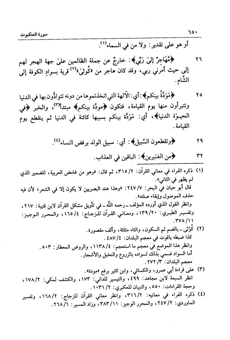 26 مُهاجِرٌ إِلى رَبِّي: خارج عن جملة الظالمين على جهة الهجر لهم إلى حيث أمرني ربي، وقد كان هاجر من «كوثى» «2» قرية بسواد الكوفة إلى الشّام.