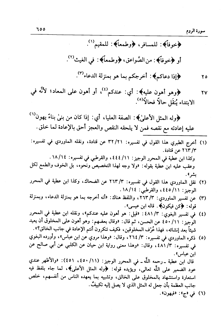 (4) في تفسير البغوي: 3/ 481: «قيل: هو أهون عليه عندكم» ، ونقله ابن عطية في المحرر الوجيز: 11/ 450 عن الحسن، ثم قال: «وقال بعضهم: وهو أهون على المخلوق أن يعيد شيئا بعد إنشائه، فهذا عرف المخلوقين، فكيف تنكرون أنتم الإعادة في جانب الخالق؟» .