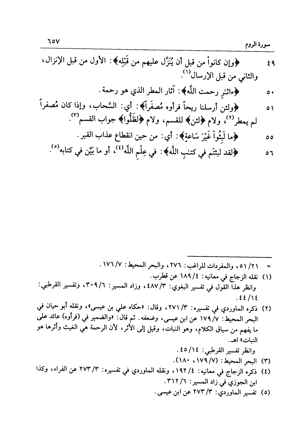 (2) ذكره الماوردي في تفسيره: 3/ 271، وقال: «حكاه علي بن عيسى» ، ونقله أبو حيان في البحر المحيط: 7/ 179 عن ابن عيسى، وضعفه. ثم قال: «والضمير في (فرأوه) عائد على ما يفهم من سياق الكلام، وهو النبات، وقيل إلى الأثر، لأن الرحمة هي الغيث وأثرها هو النبات» اه.