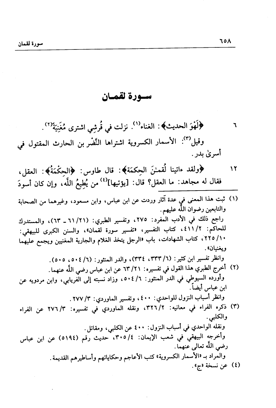 راجع ذلك في الأدب المفرد: 275، وتفسير الطبري: (21/ 61- 63) ، والمستدرك للحاكم: 2/ 411، كتاب التفسير، «تفسير سورة لقمان» ، والسنن الكبرى للبيهقي: