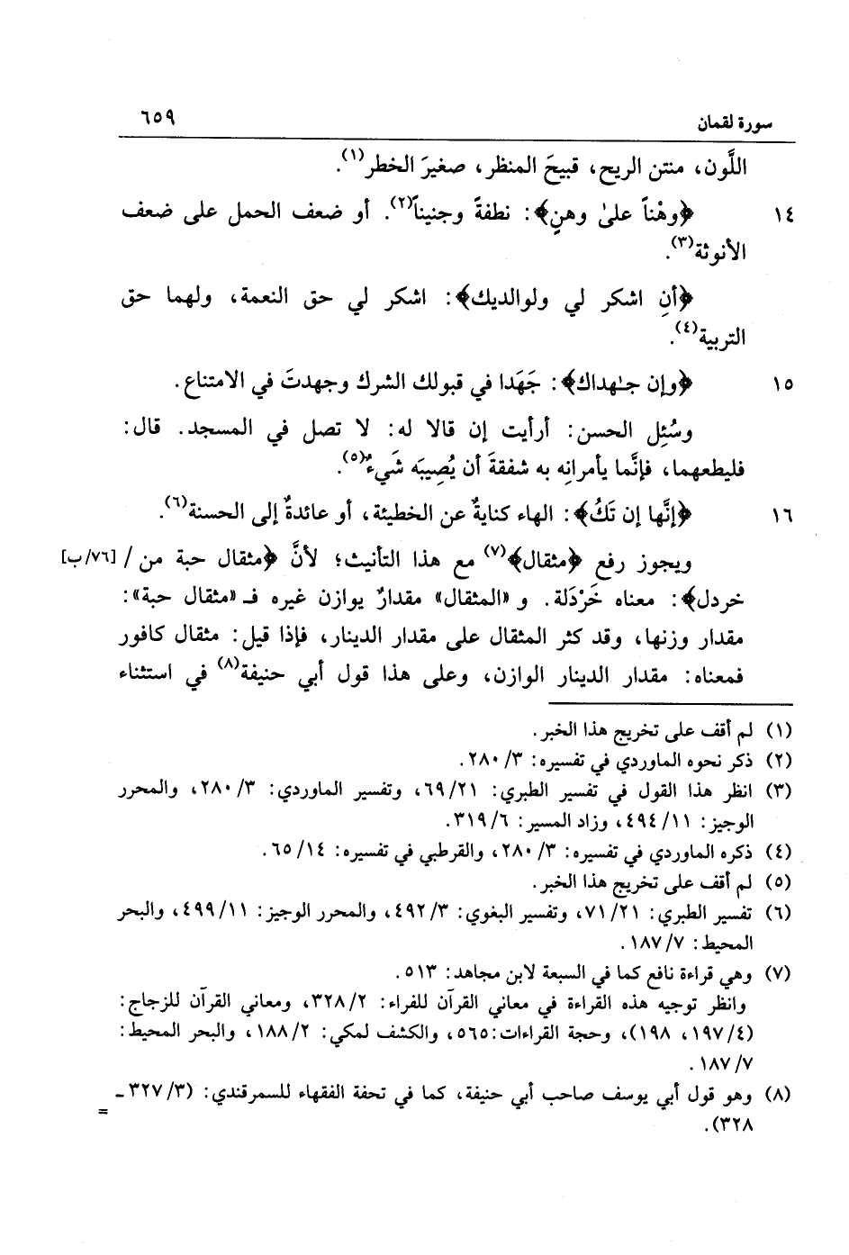 14 وَهْناً عَلى وَهْنٍ: نطفة وجنينا «2» . أو ضعف الحمل على ضعف الأنوثة «3» .