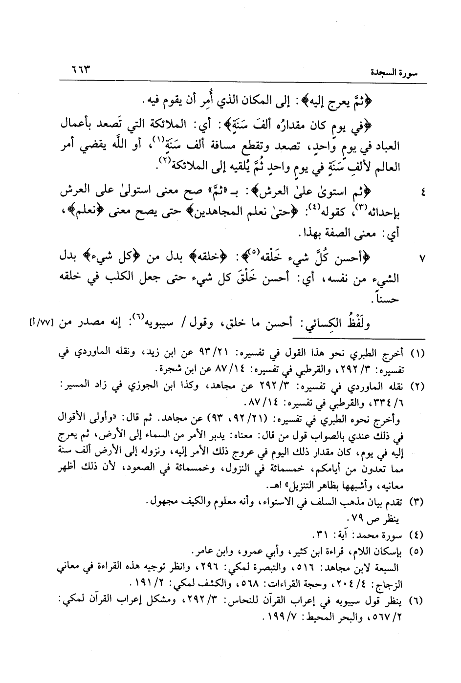 وأخرج نحوه الطبري في تفسيره: (21/ 92، 93) عن مجاهد. ثم قال: «وأولى الأقوال في ذلك عندي بالصواب قول من قال: معناه: يدبر الأمر من السماء إلى الأرض، ثم يعرج إليه في يوم، كان مقدار ذلك اليوم في عروج ذلك الأمر إليه، ونزوله إلى الأرض ألف سنة مما تعدون من أيامكم، خمسمائة في النزول، وخمسمائة في الصعود، لأن ذلك أظهر معانيه، وأشبهها بظاهر التنزيل» اه.