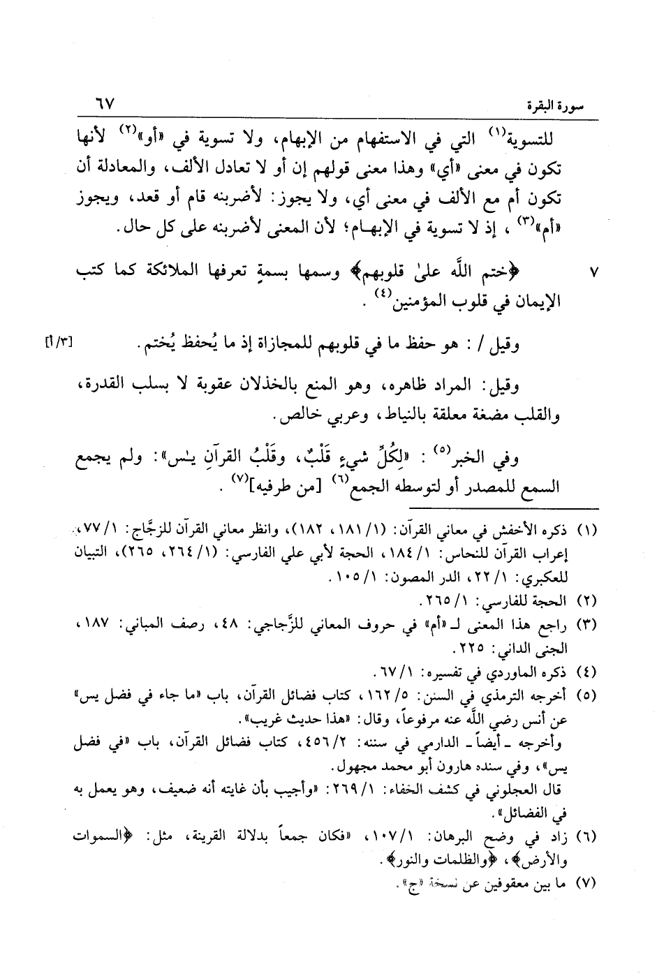 7 خَتَمَ اللَّهُ عَلى قُلُوبِهِمْ وسمها بسمة تعرفها الملائكة كما كتب الإيمان في قلوب المؤمنين «4» .