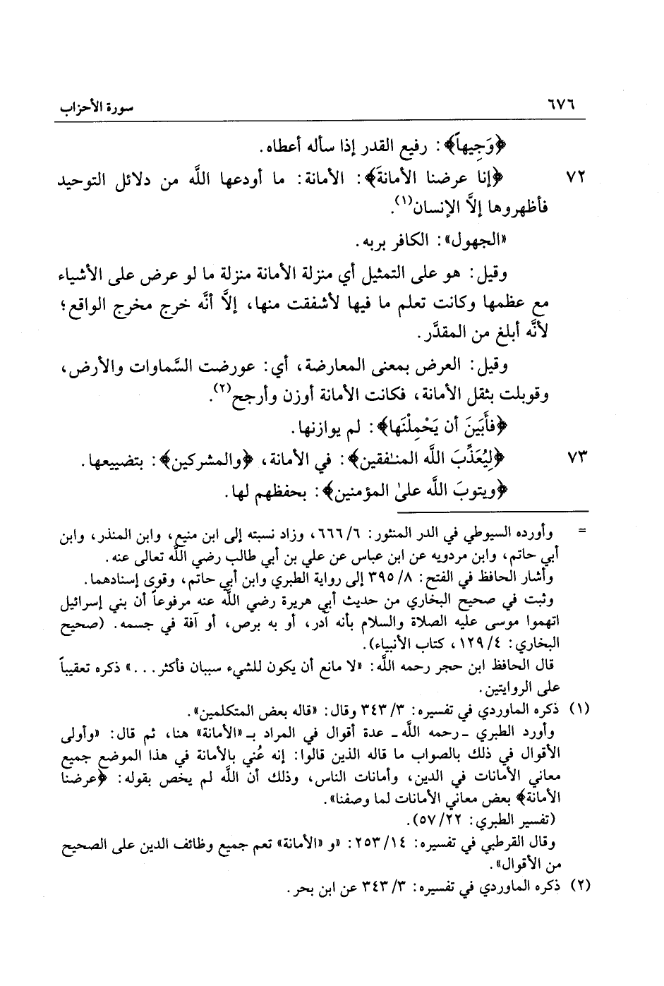 وأورد الطبري- رحمه الله- عدة أقوال في المراد ب «الأمانة» هنا، ثم قال: «وأولى الأقوال في ذلك بالصواب ما قاله الذين قالوا: إنه عني بالأمانة في هذا الموضع جميع معاني الأمانات في الدين، وأمانات الناس، وذلك أن الله لم يخص بقوله: عَرَضْنَا الْأَمانَةَ بعض معاني الأمانات لما وصفنا» .
