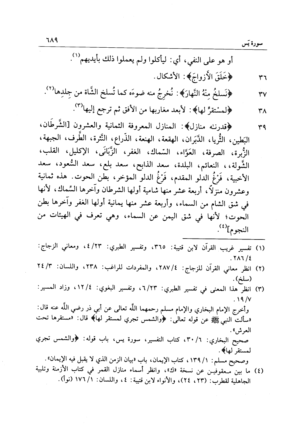39 قَدَّرْناهُ مَنازِلَ: المنازل المعروفة الثمانية والعشرون [الشّرطان، البطين، الثّريا، الدّبران، الهقعة، الهنعة، الذّراع، النّثرة، الطّرف، الجبهة، الزّبرة، الصرفة، العوّاء، السّماك، الغفر، الزّباني، الإكليل، القلب، الشّولة،، النعائم، البلدة، سعد الذابح، سعد بلع، سعد السّعود، سعد الأخبية، فرغ الدلو المقدم، فرغ الدلو المؤخر، بطن الحوت. هذه ثمانية وعشرون منزلا، أربعة عشر منها شامية أولها الشرطان وآخرها السّماك، لأنها في شق الشام من السماء، وأربعة عشر منها يمانية أولها الغفر وآخرها بطن الحوت لأنها في شق اليمن عن السماء، وهي تعرف في الهيئات من النجوم] «4» .
