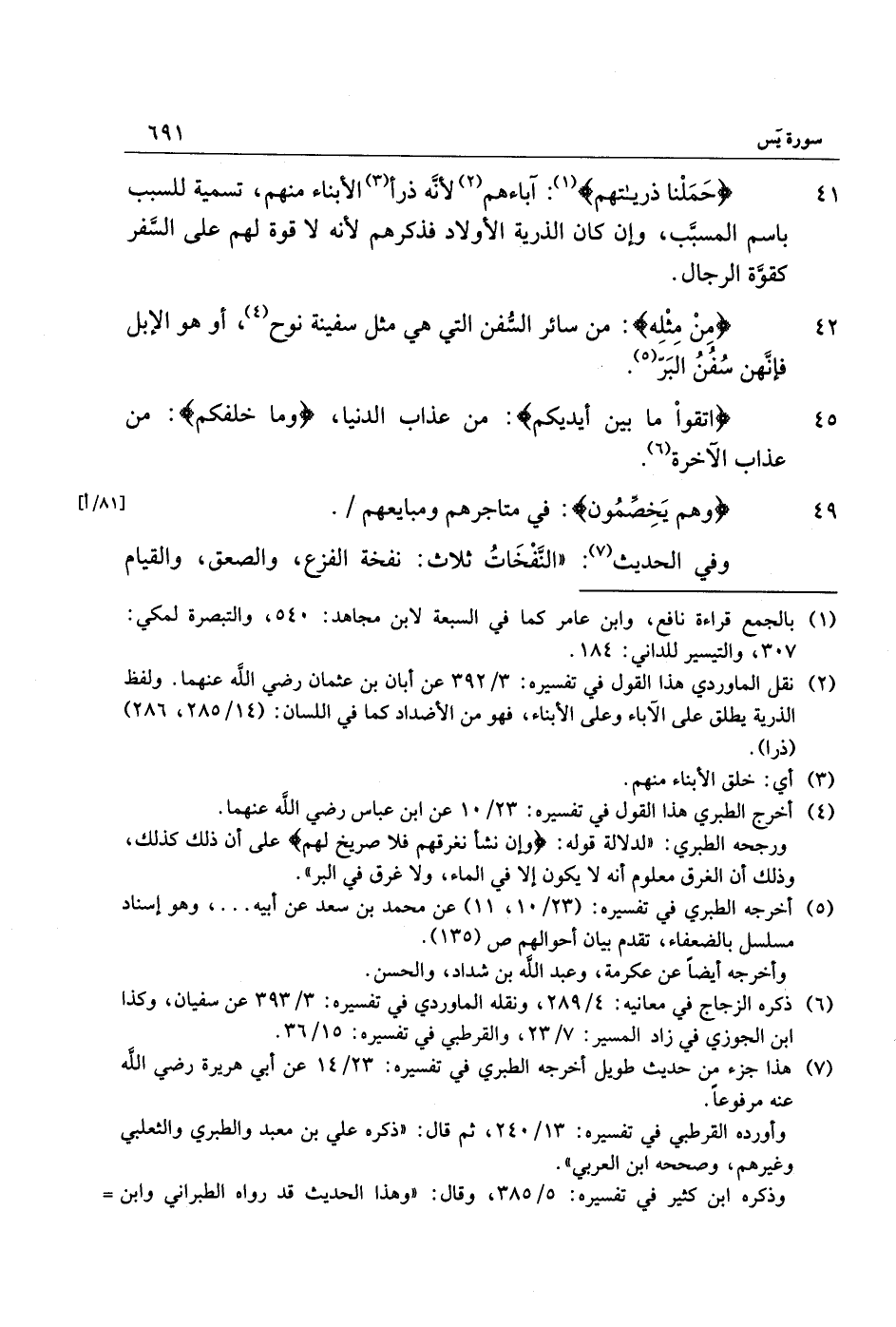 41 حَمَلْنا ذُرِّيَّتَهُمْ «1» : آباءهم «2» لأنّه ذرأ «3» الأبناء منهم، تسمية للسبب باسم المسبّب، وإن كان الذرية الأولاد فذكرهم لأنه لا قوة لهم على السّفر كقوّة الرجال.