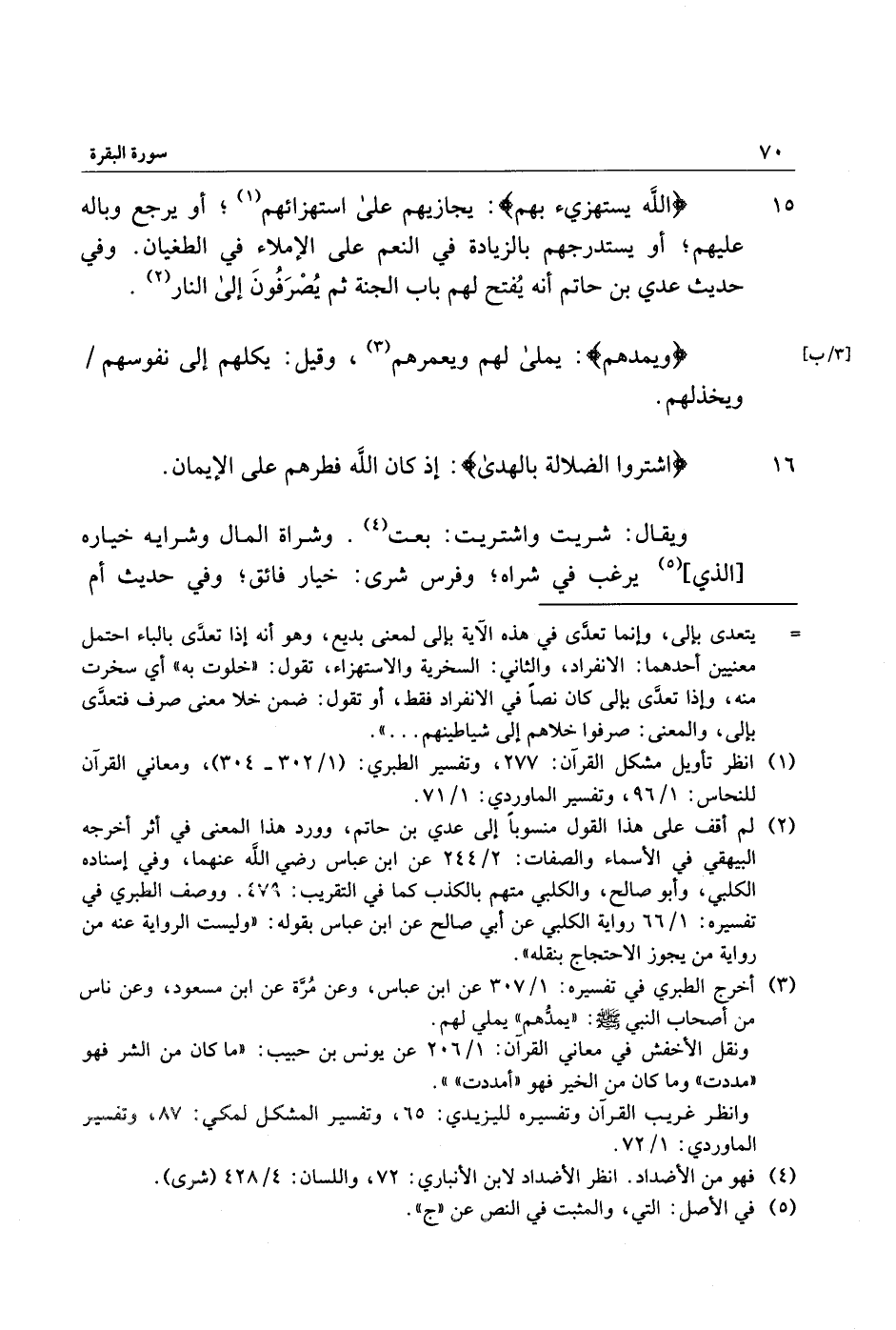 (3) أخرج الطبري في تفسيره: 1/ 307 عن ابن عباس، وعن مرّة عن ابن مسعود، وعن ناس من أصحاب النبي صلّى الله عليه وسلّم: «يمدّهم» يملي لهم.