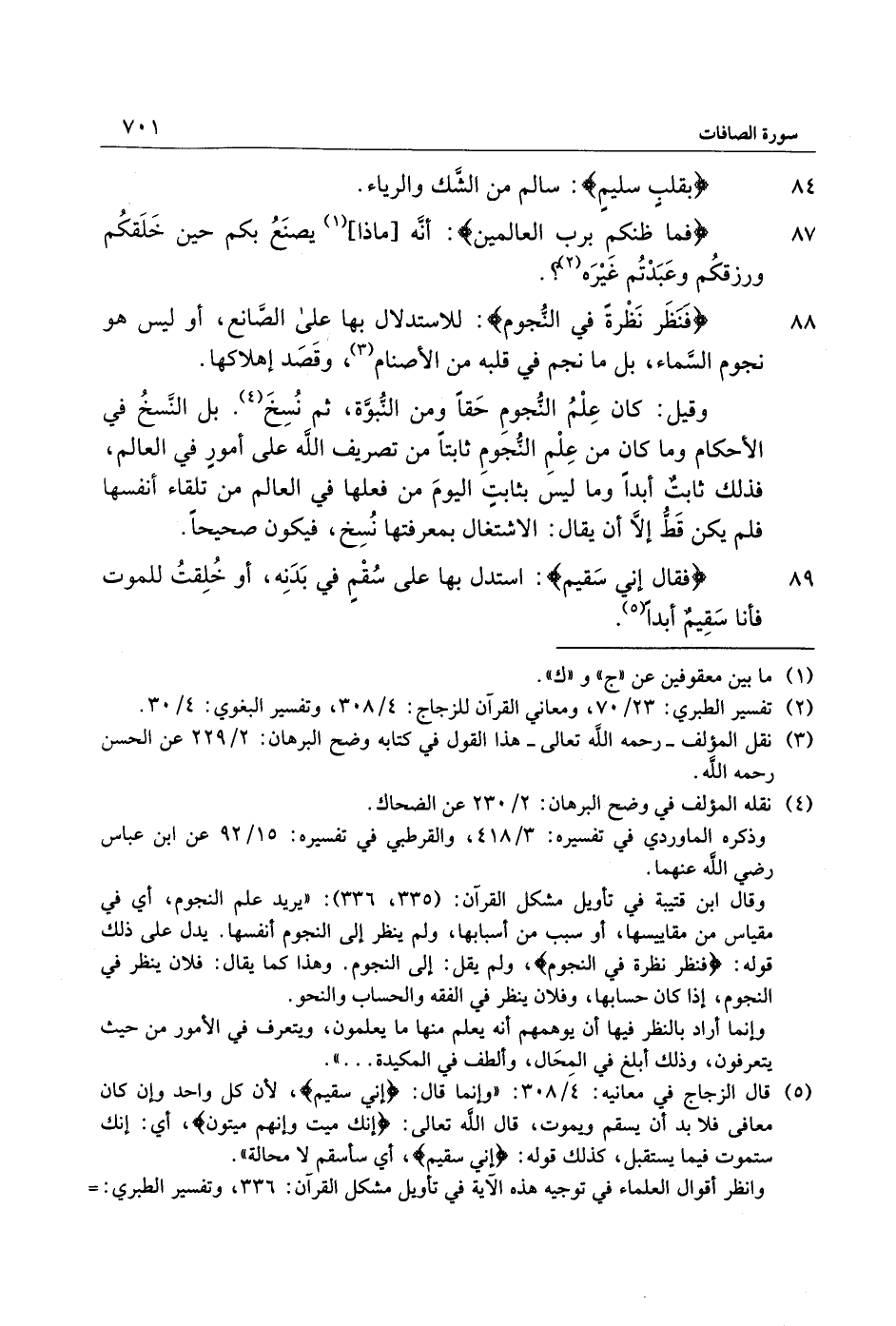 88 فَنَظَرَ نَظْرَةً فِي النُّجُومِ: للاستدلال بها على الصّانع، أو ليس هو نجوم السّماء، بل ما نجم في قلبه من الأصنام «3» ، وقصد إهلاكها.